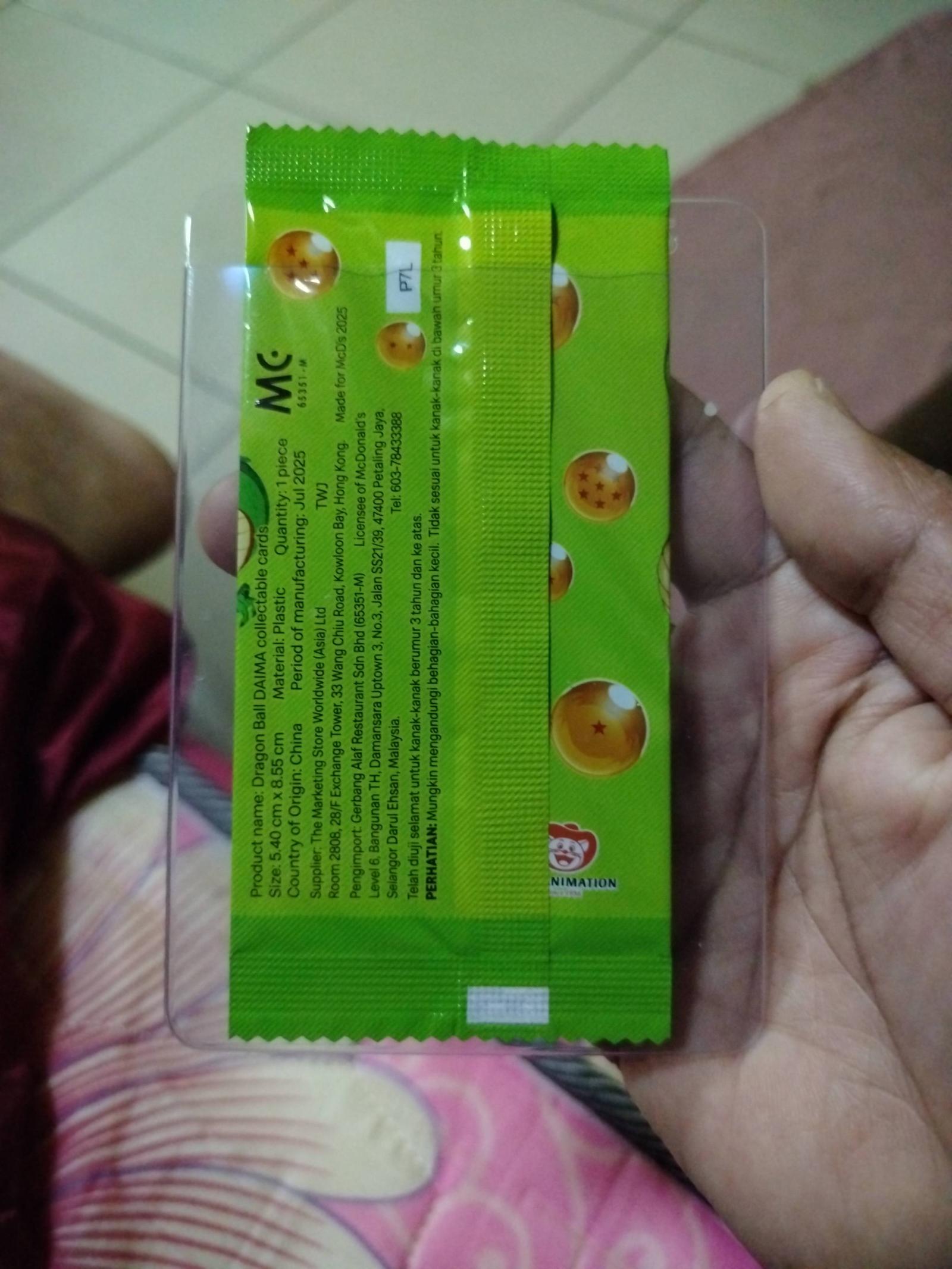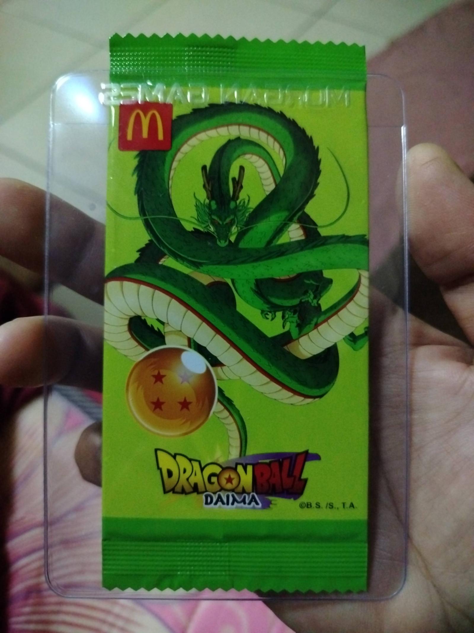 Sealed Dragon Ball DAIMA collectible trading card pack in original McDonald's branded packaging. Features iconic Shenron artwork and Dragon Ball logo. Made of plastic with dimensions approximately 5.40cm x 8.55cm. Manufactured in China with a production date of July 2025. The packaging shows no visible damage and is stored in a protective sleeve. A great addition for Dragon Ball and collectible card game fans.