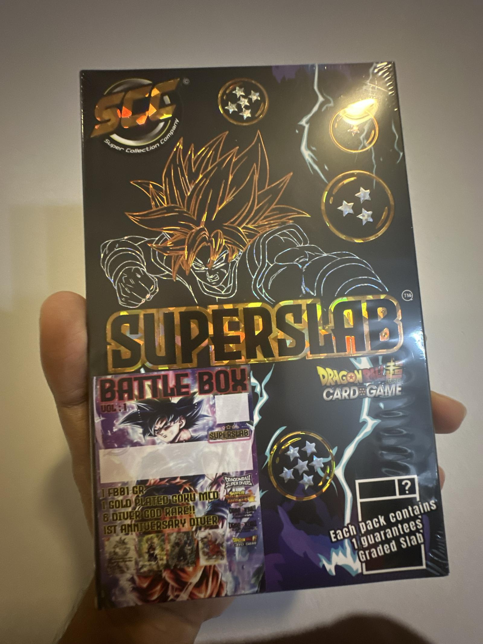 Sealed Dragon Ball SuperSlab Battle Box featuring premium graded cards including 1 FF81 GR, 1 Gold Plated Goku MCD, 6 Diver God Rare cards, and 1st Anniversary Diver. Officially partnered with premier card grading companies such as PCG, CGC, PSA, and AGS. Perfect for collectors seeking exclusive Dragon Ball card game items.