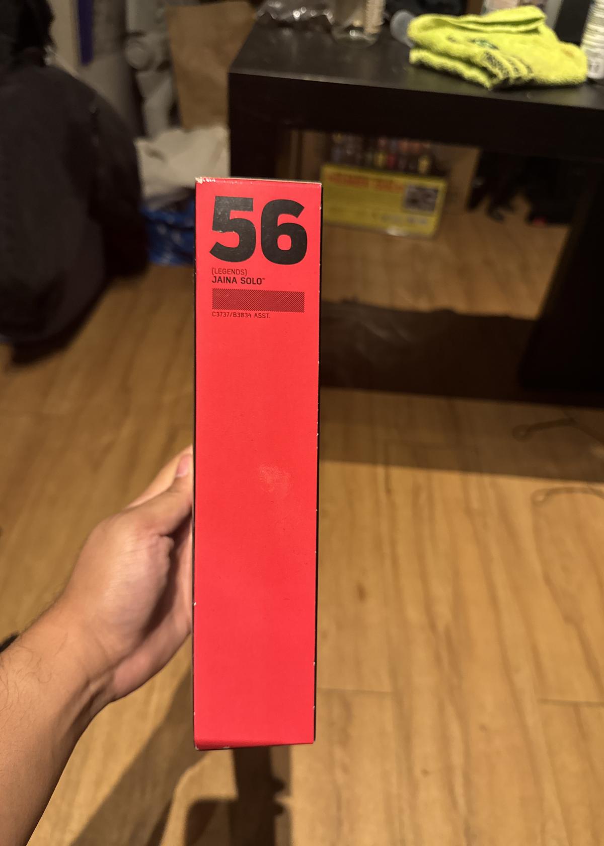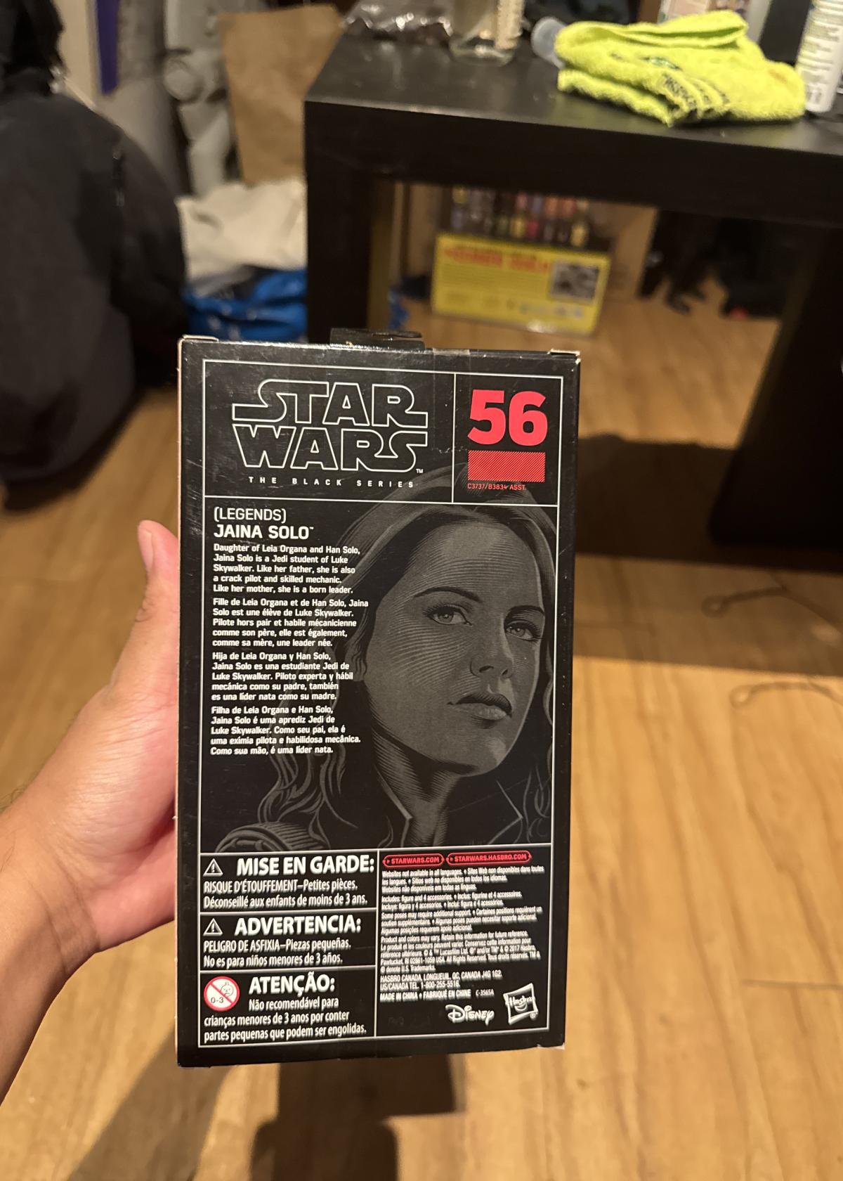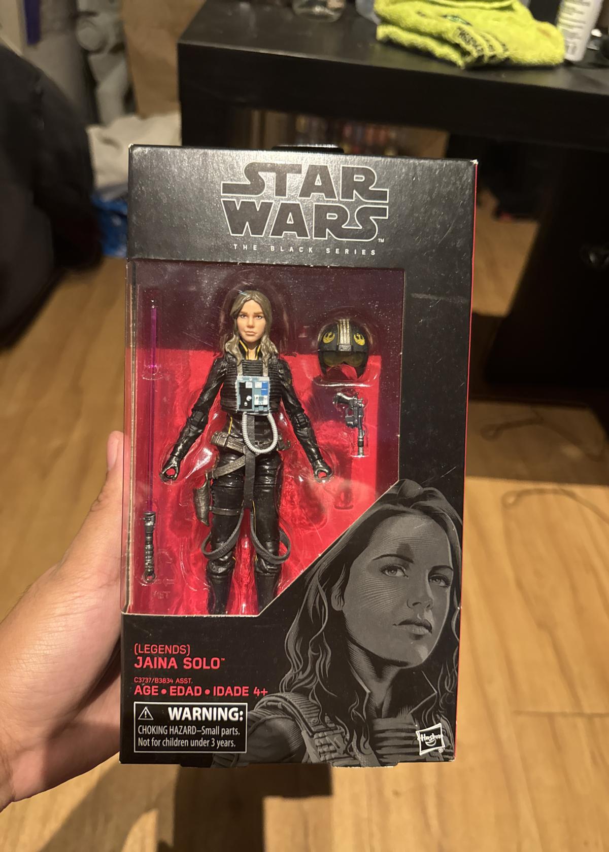This is a Star Wars The Black Series Jaina Solo action figure (#56), part of the Legends line by Hasbro. The figure is 6 inches tall and comes with accessories including a helmet and blaster. The packaging features detailed artwork of the character. Suitable for collectors and fans aged 4 and up. The box is unopened and includes all original components.