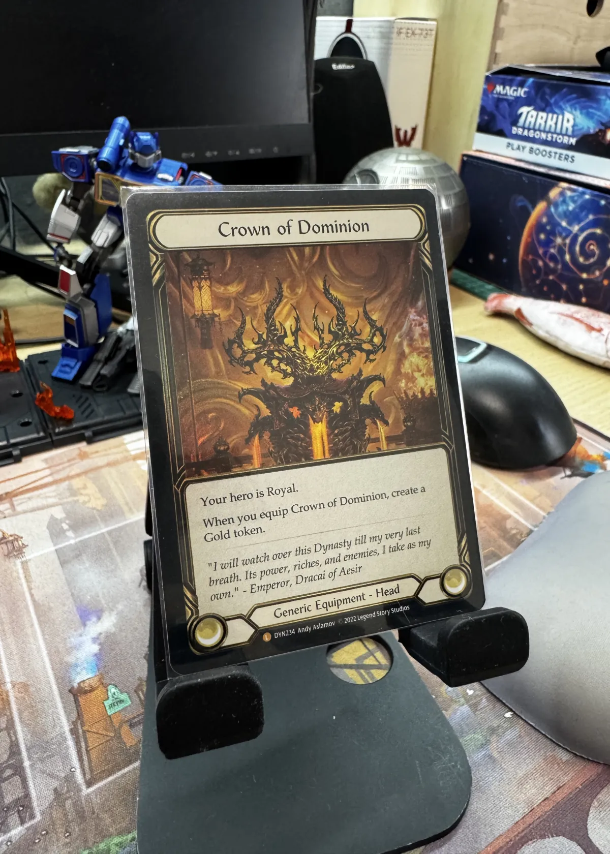 The Crown of Dominion is notable for granting your hero the Royal trait and creating a Gold token upon equipping, making it a valuable asset in gameplay strategies focused on control and resource advantage. This card is popular among collectors and players alike for its utility and striking artwork.