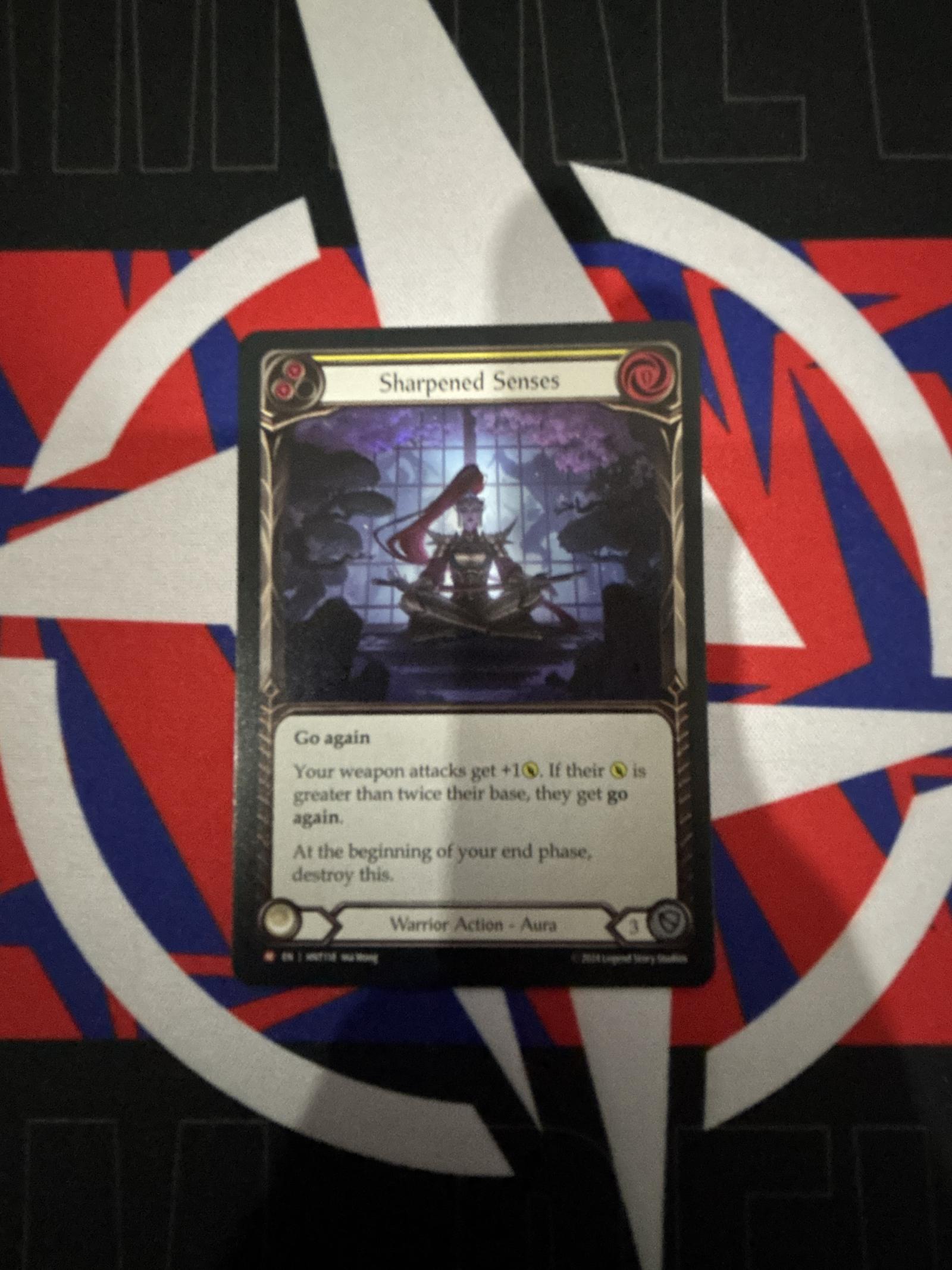 A Flesh and Blood trading card titled 'Sharpened Senses'. This Warrior Action - Aura card features the ability: Go again; your weapon attacks get +1; if their is greater than twice their base, they get go again. At the beginning of your end phase, destroy this. Card is shown on a playing mat, with visible slight edge wear and minor surface imperfections.