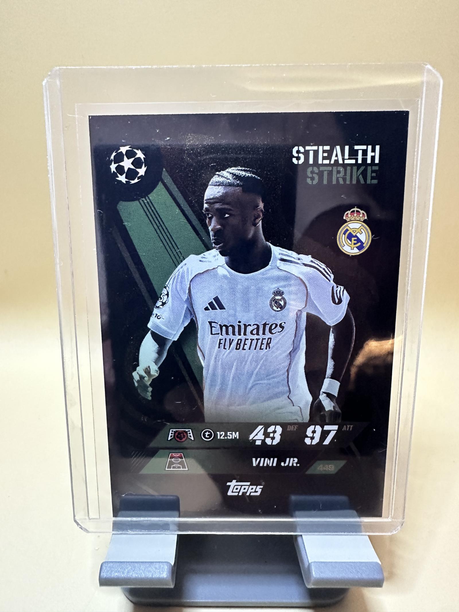 A Topps Stealth Strike football card featuring Vini Jr. from Real Madrid.