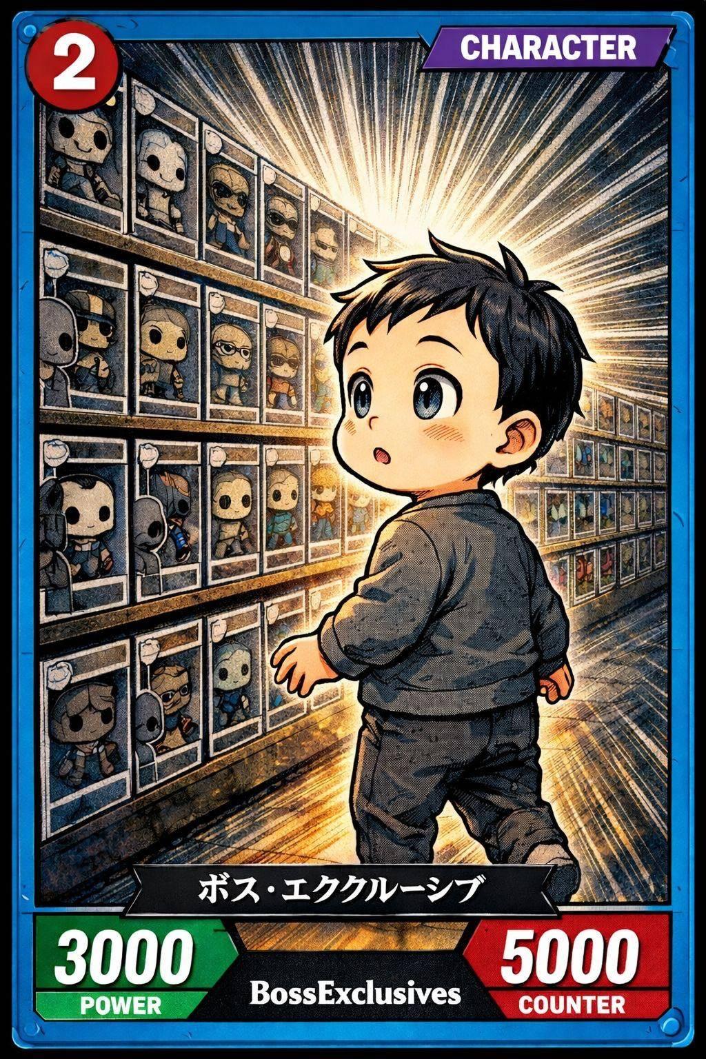 A collectible trading card featuring a chibi character admiring a wall of Funko Pop figures, labeled as 'Boss Exclusives'. The card displays power and counter stats: 3000 and 5000 respectively. The card text includes some Japanese characters. Suitable for Funko Pop fans and trading card collectors.