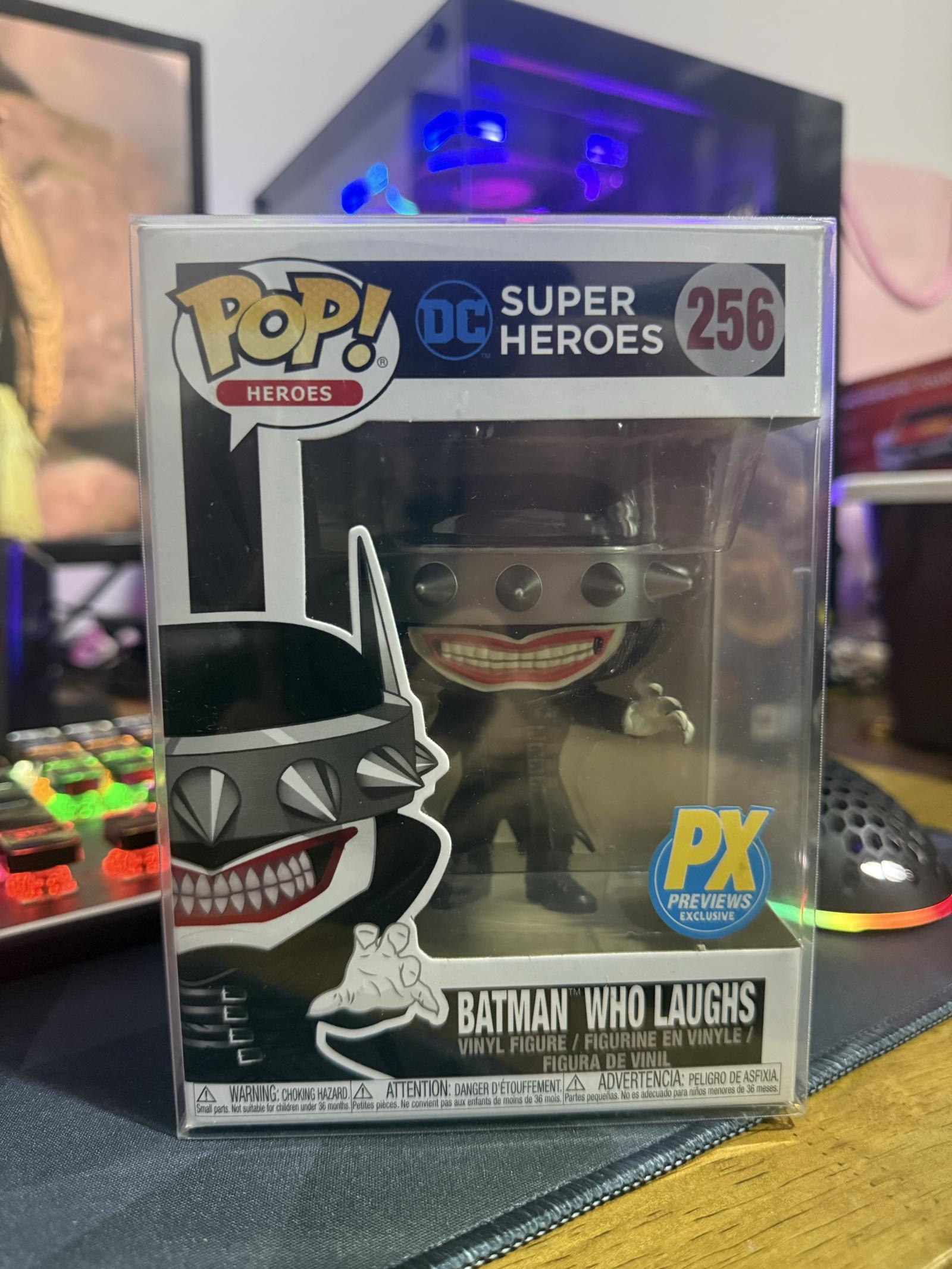 This collectible Funko Pop! vinyl figure features Batman Who Laughs from the DC Super Heroes series. It is a PX Previews Exclusive, numbered 256. The figure is displayed in its original window-box packaging, showcasing the character's distinctive spiked helmet and sinister grin. Ideal for DC Comics and Funko Pop collectors.