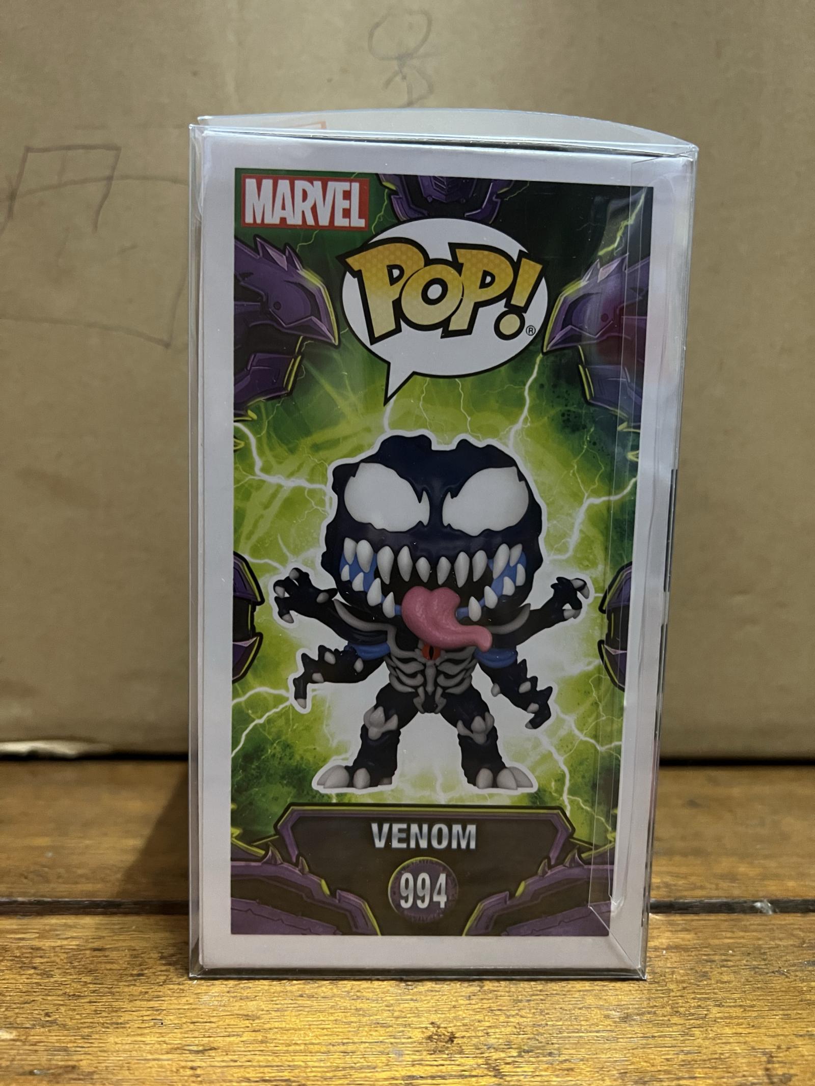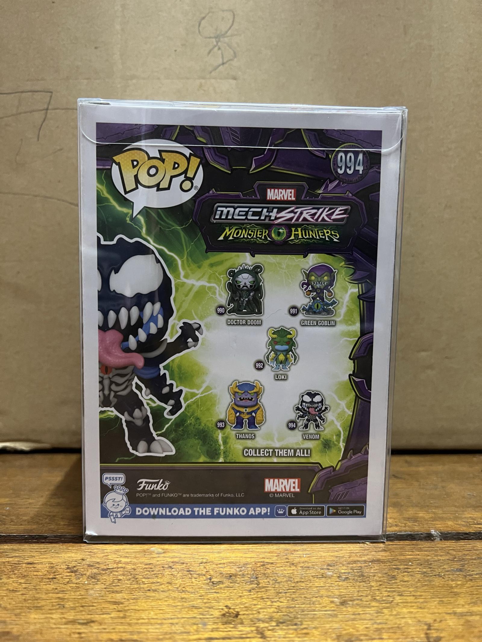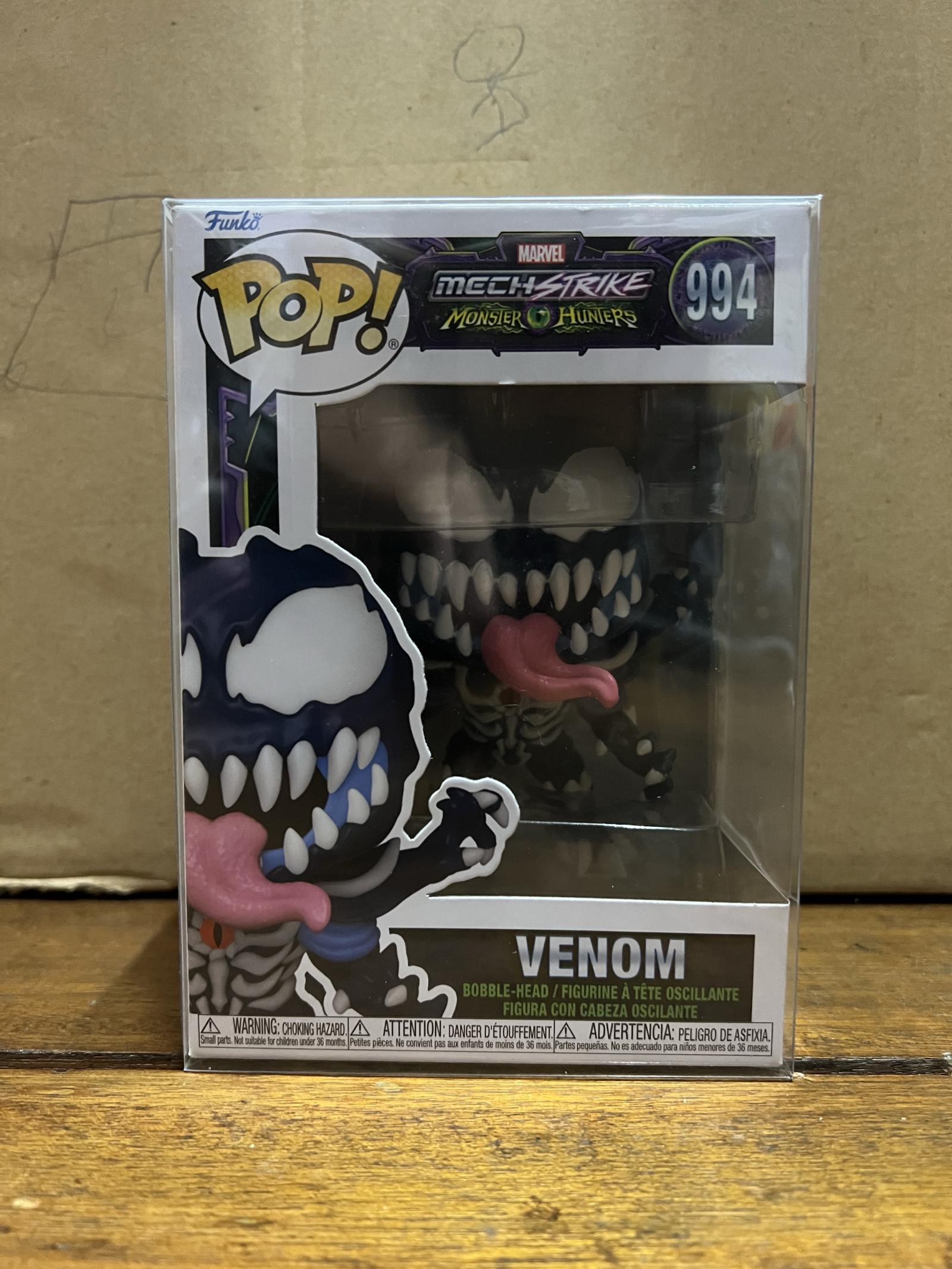 This Funko Pop! features Venom from the Marvel Mech Strike Monster Hunters series, figure #994. The collectible vinyl figure showcases Venom with a detailed design and a bobble-head feature. The figure is presented in its original box with vibrant artwork and clear display window. A must-have for Marvel and Funko Pop! collectors.