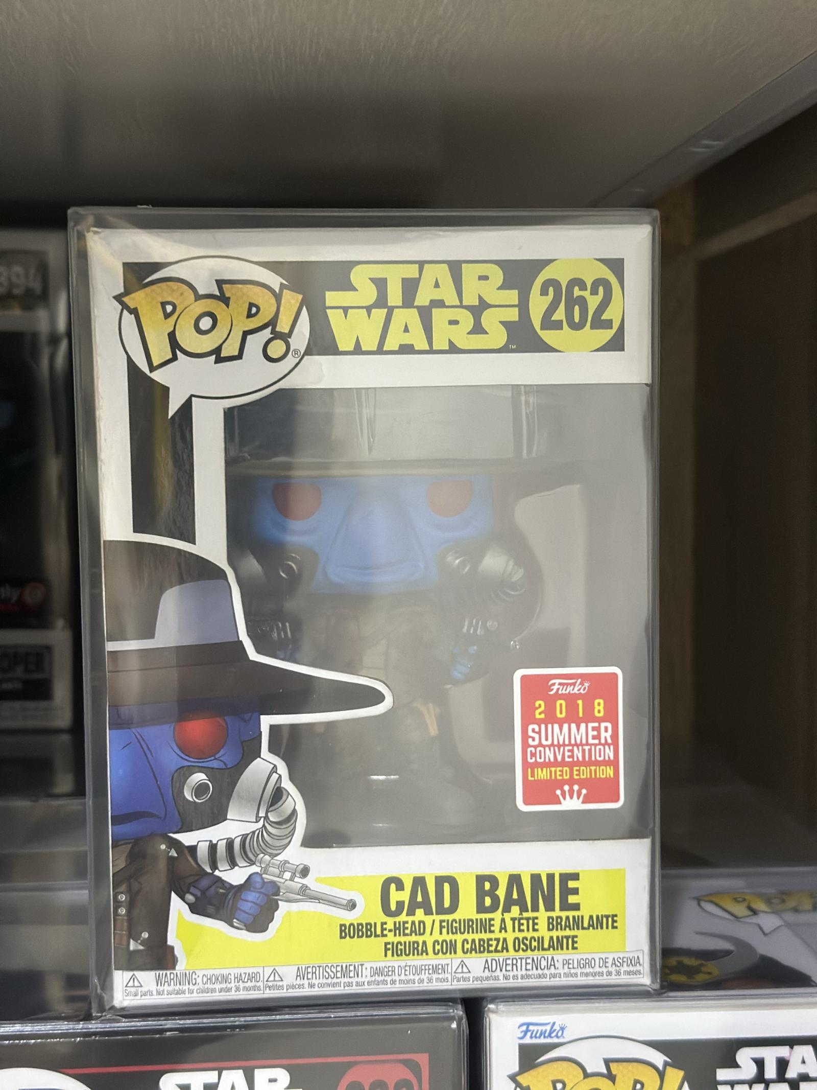 Limited edition Funko Pop figure of Cad Bane from Star Wars, number 262 in the series, released for the 2018 Summer Convention. The figure is a bobble-head and comes in its original packaging with a protective case.