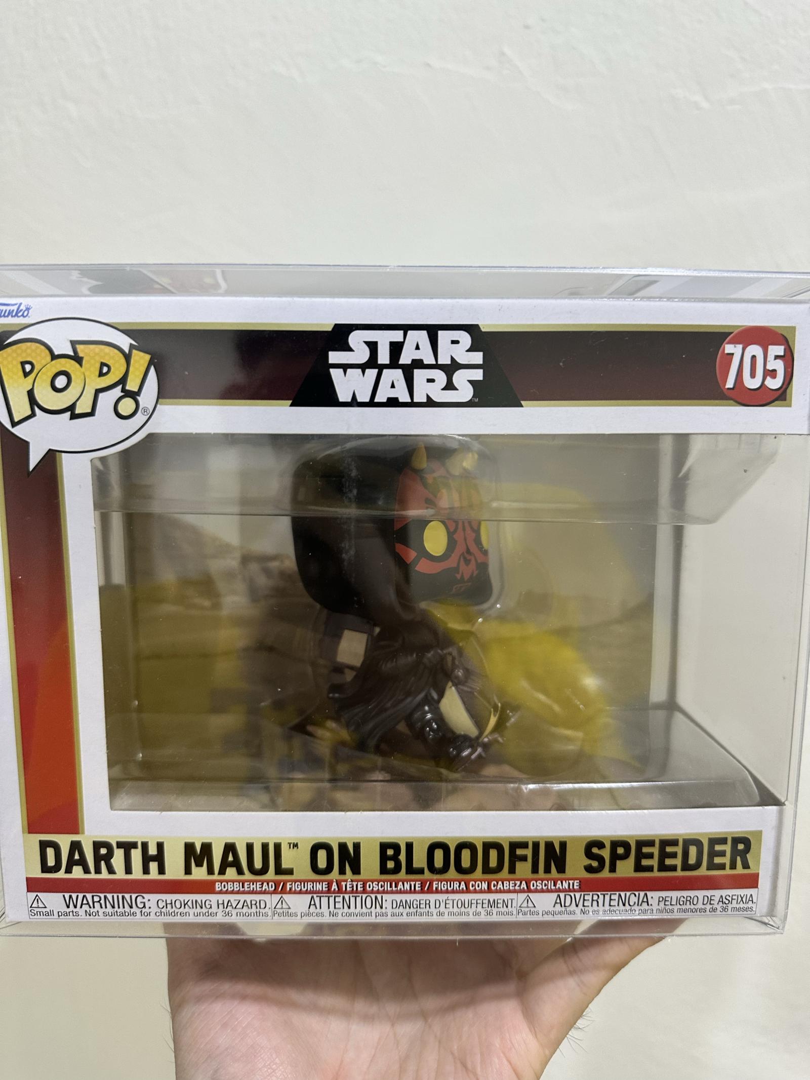 This Funko Pop collectible features Darth Maul on Bloodfin Speeder from the Star Wars series. It is a bobblehead figure, number 705 in the collection. The item is displayed in its original packaging, which appears intact and clear.