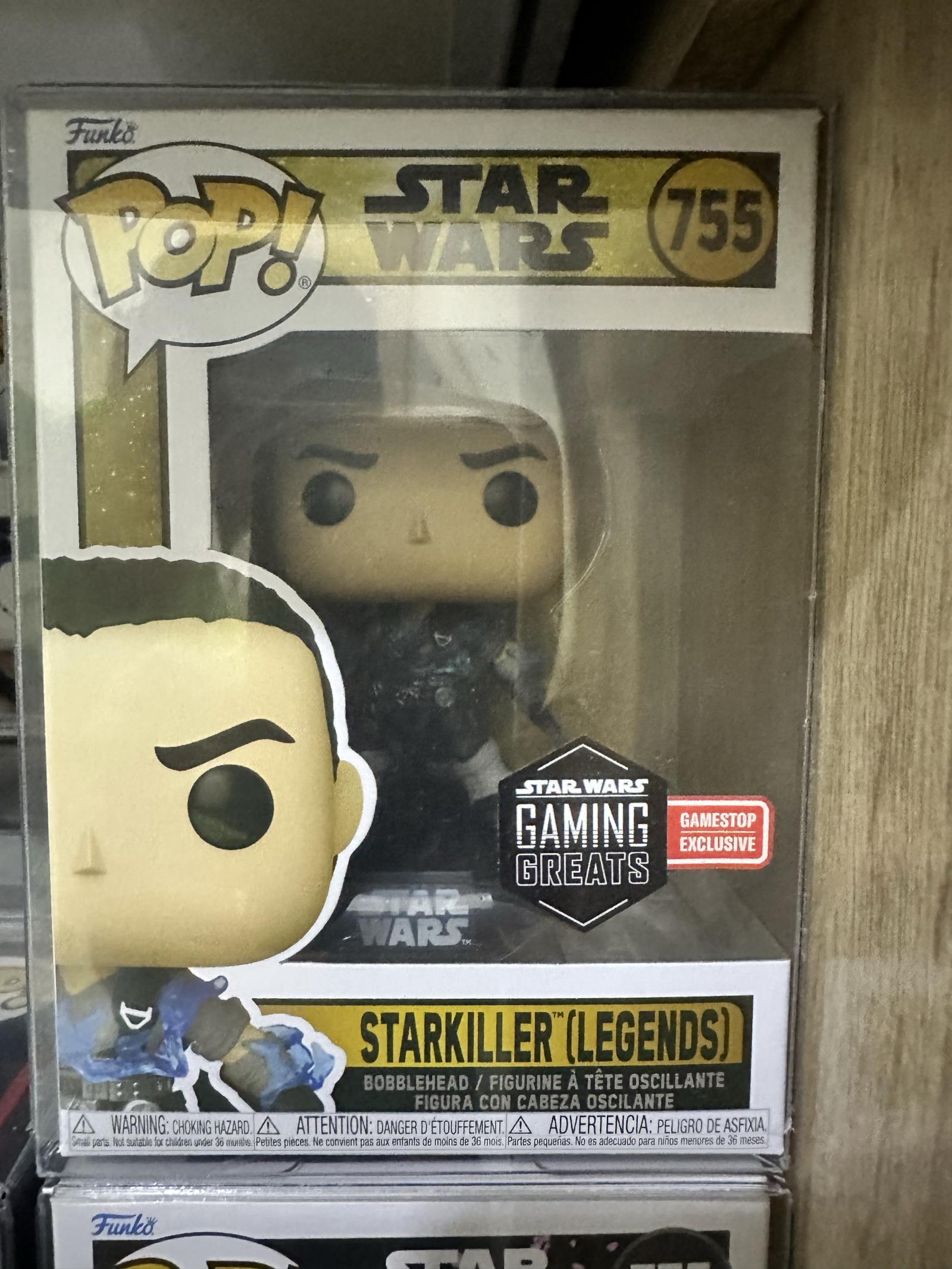 This Funko Pop! figure features Starkiller (Legends) from the Star Wars Gaming Greats series. It is a Gamestop exclusive collectible, numbered 755. The figure is a bobblehead and comes in its original window display box.
