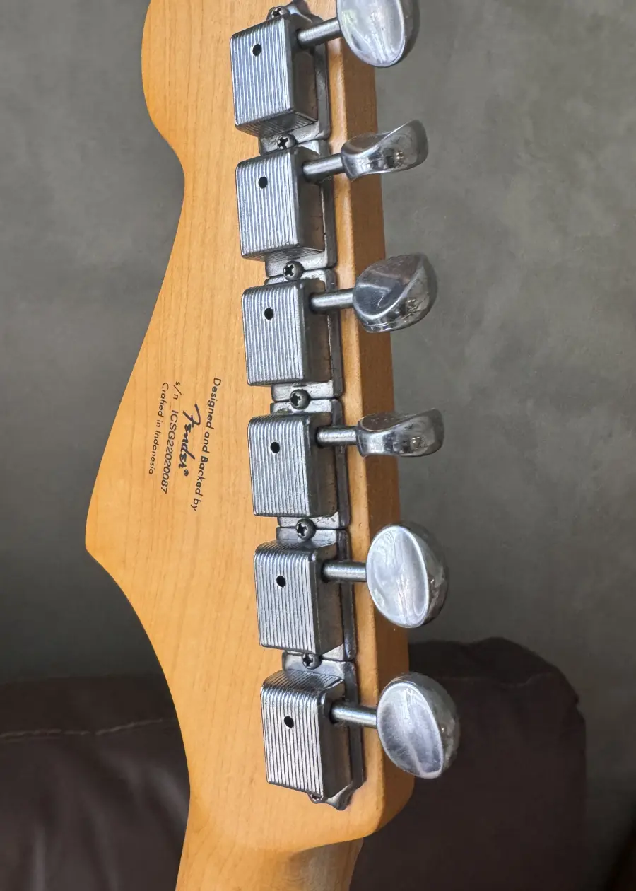Poplar body with a gloss finish Maple neck in a slim "C"-shaped profile, Maple fretboard Dual Fender-designed single-coil pickups, lead/rhythm switch Gold-plated vintage-style tuners and 6-saddle vintage-style Bridge with non-locking, floating vibrato