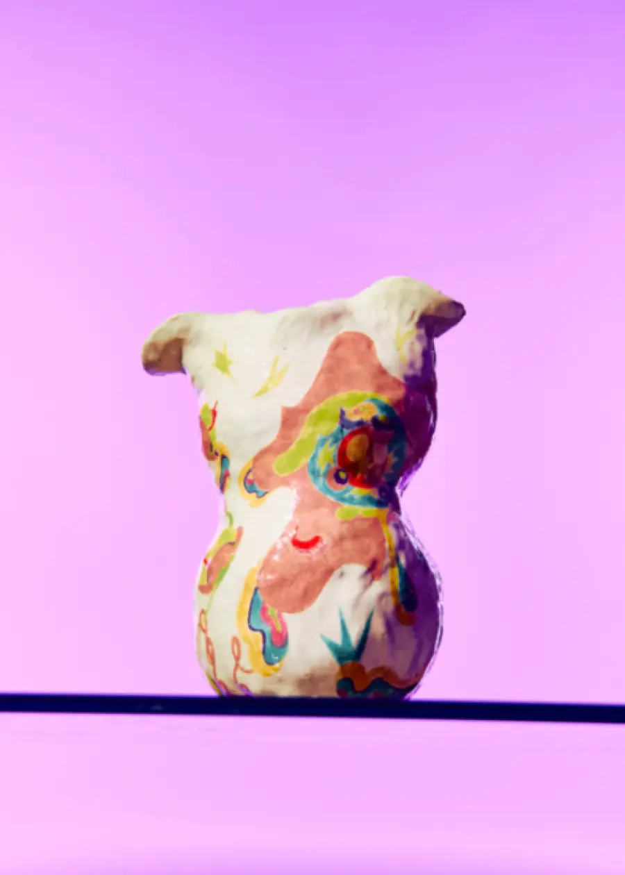 The piece, titled "Bloom," represents thriving amidst adversity. It depicts a face partially emerging from within. On the other side, blooming flowers with loose threads weave through them, illustrating the interplay of beauty and resilience.