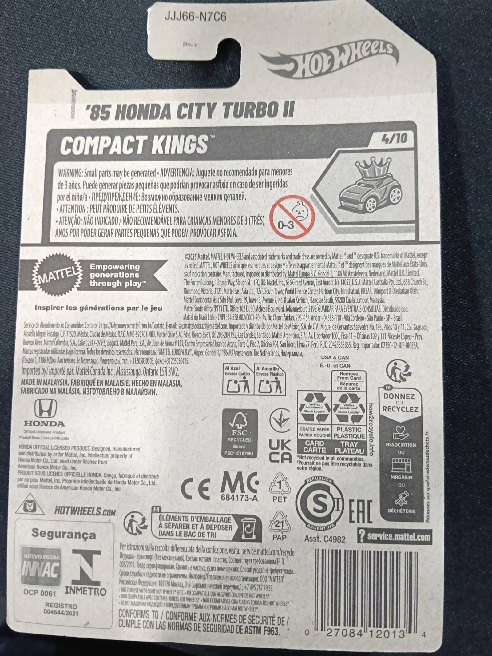 Hot Wheels '85 Honda City Turbo II miniature car from the Compact Kings series. This collectible die-cast model is black with red and yellow racing stripes and detailed with 'Turbo II' decals. It is part number 105 of 250 and is 4 out of 10 in the Compact Kings collection. Ideal for collectors and enthusiasts of classic Hot Wheels vehicles.