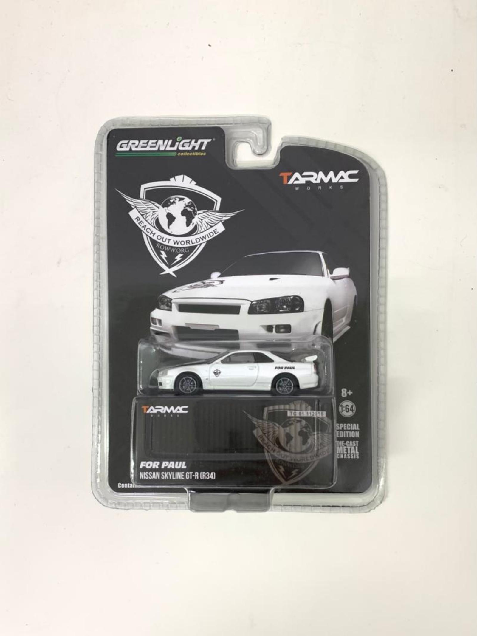 A Greenlight Tarmac Works collectible 1:64 scale die-cast model of the Nissan Skyline GT-R (R34) with 'For Paul' detailing. This special edition features a white paint finish with detailed exterior and metal chassis. Perfect for collectors and fans of iconic JDM cars.