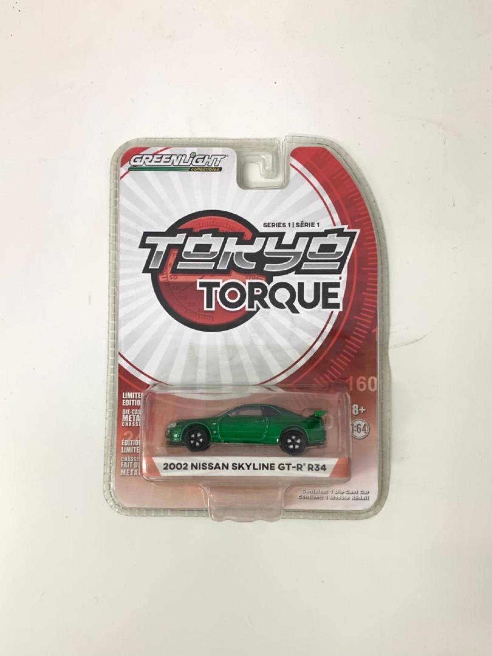 Limited edition Greenlight Tokyo Torque Series 1 diecast model of the 2002 Nissan Skyline GT-R R34. Features metal chassis and detailed design in a vibrant green color. Scale 1:64. Comes sealed in original packaging, ideal for collectors.