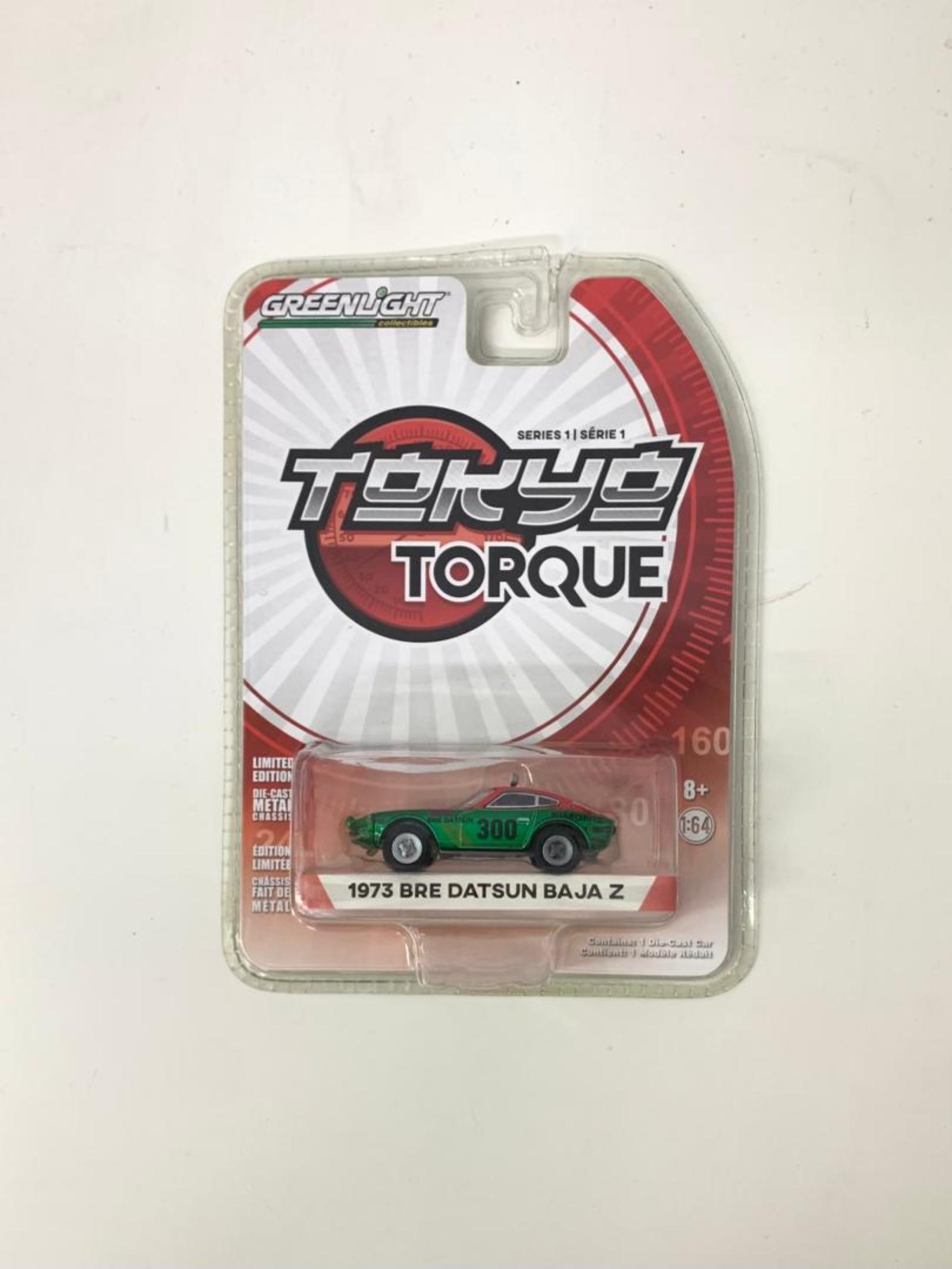 Limited edition GreenLight Torque Series 1 die-cast model of the 1973 BRE Datsun Baja Z. This 1:64 scale collectible features detailed metal chassis and authentic design. Packaging is intact with minor wear visible.