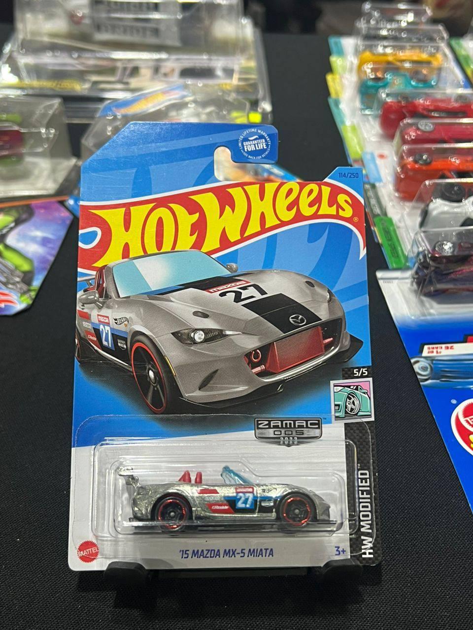 Collectors item Hot Wheels '15 Mazda MX-5 Miata in the exclusive ZAMAC finish, part of the 2023 series 114/250. Features detailed racing decals, red rims, and is sealed in original packaging. This version is 5/5 in the HW Modified lineup, perfect for Hot Wheels enthusiasts and Mazda fans.