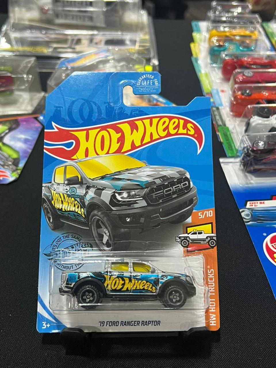 '19 Ford Ranger Raptor Hot Wheels diecast car from the HW Hot Trucks series, number 5 out of 10. Features detailed blue and yellow design with Ford and Hot Wheels branding. Suitable for collectors and kids aged 3 and above. The car is new and unopened in its original packaging.