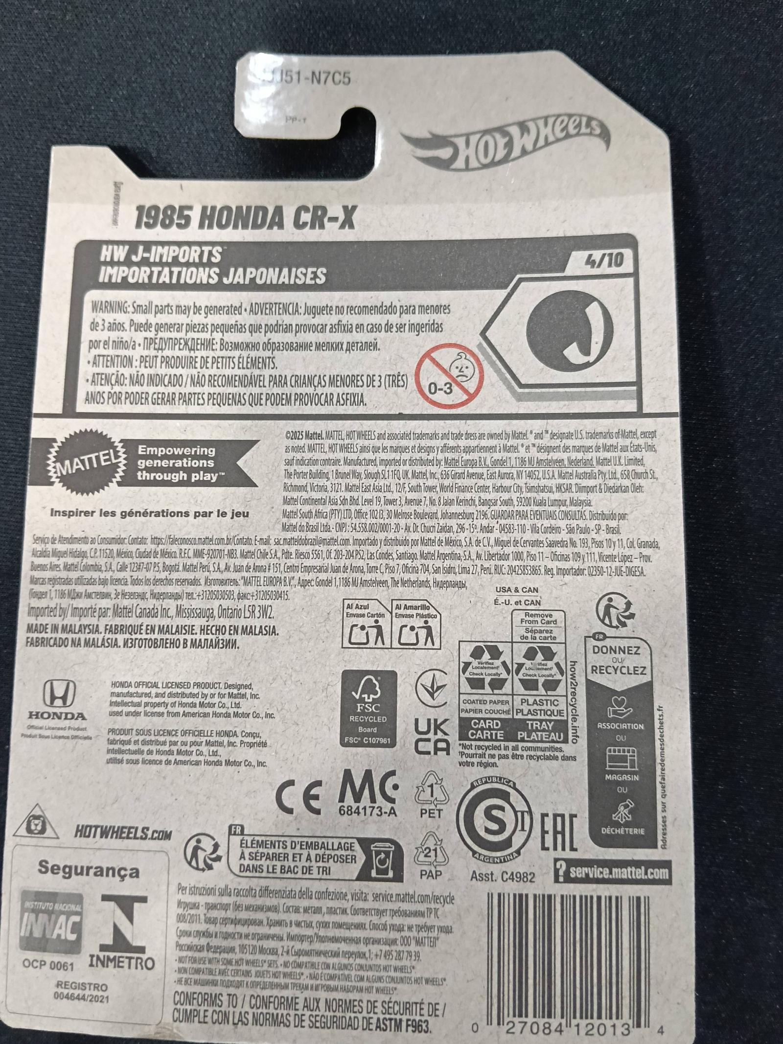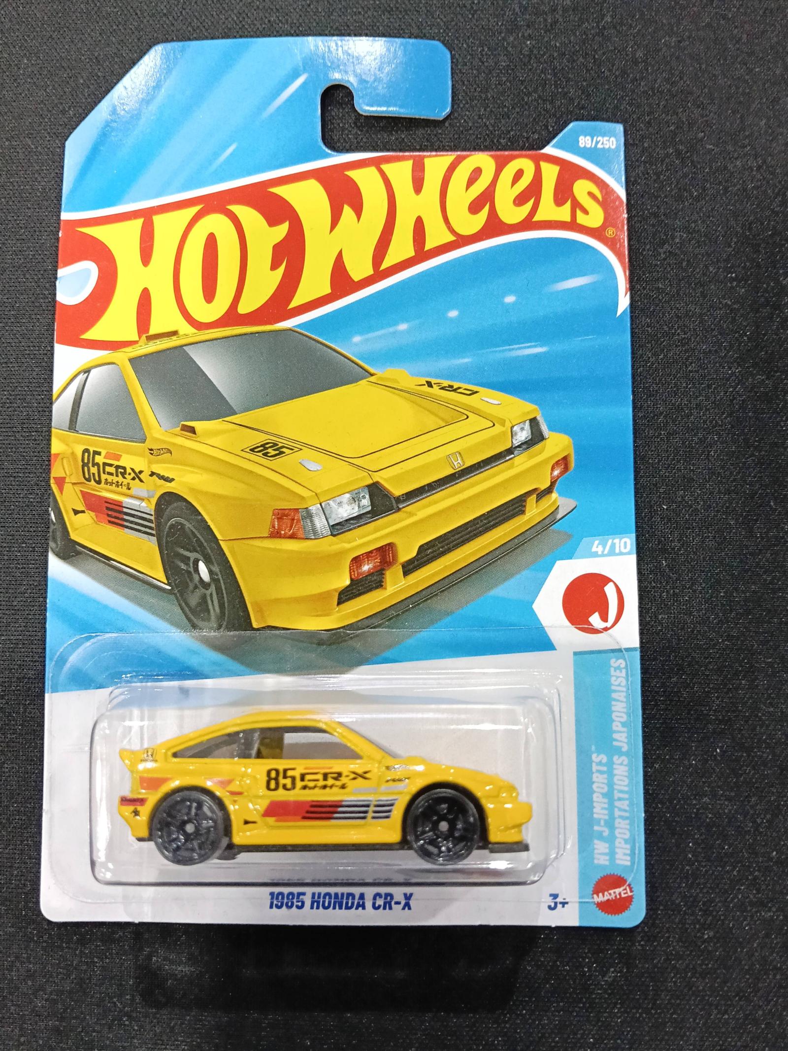 This Hot Wheels collectible features a detailed yellow 1985 Honda CR-X from the HW J-Imports series. It is number 4 out of 10 in the series and 89 out of 250 in the 2023 mainline collection. The car is packaged in its original blister card with vibrant artwork and clear branding. Suitable for collectors and Hot Wheels enthusiasts aged 3 and up.
