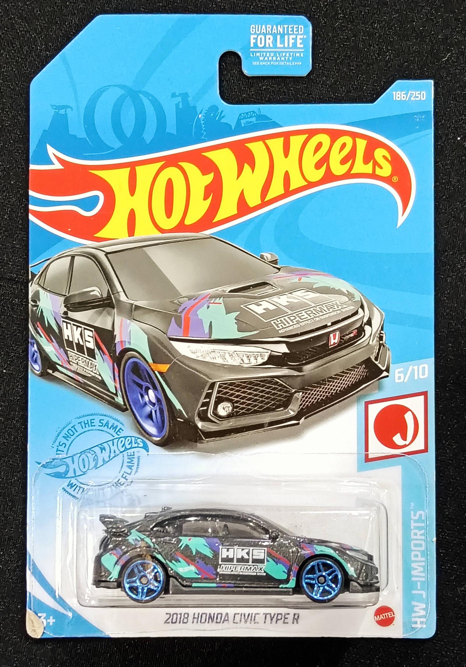 This Hot Wheels collectible features a 2018 Honda Civic Type R from the HW J-Imports series, numbered 6 out of 10 in the set. The die-cast car is black with colorful decals and blue wheels, showcasing the HKS branding. The packaging is intact with minor wear visible at the bottom left corner. A great addition for Hot Wheels and JDM car enthusiasts.This item is from US