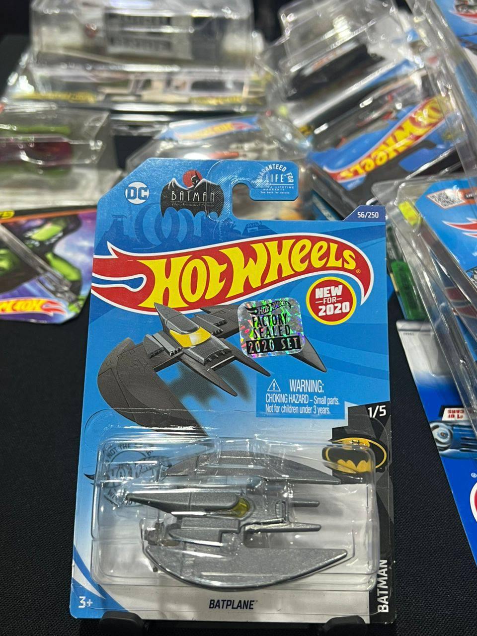 2020 Hot Wheels Batplane from the Batman series, car number 56 out of 250. Factory sealed in original packaging, part of the 2020 set. Featuring sleek silver Batplane design with yellow cockpit details. Suitable for collectors and fans of Batman memorabilia. Ages 3+.
