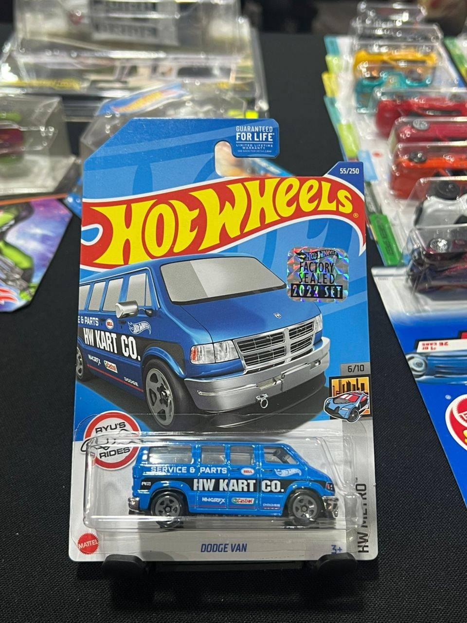 This is a Hot Wheels 2022 Factory Sealed collectible Dodge Van from the HW Kart Co. series. It is carded and features vibrant blue paint with detailed racing decals. Part of the 2022 set, numbered 55 out of 250 and 6/10 in the series. Perfect for collectors looking for a mint condition Hot Wheels toy car.