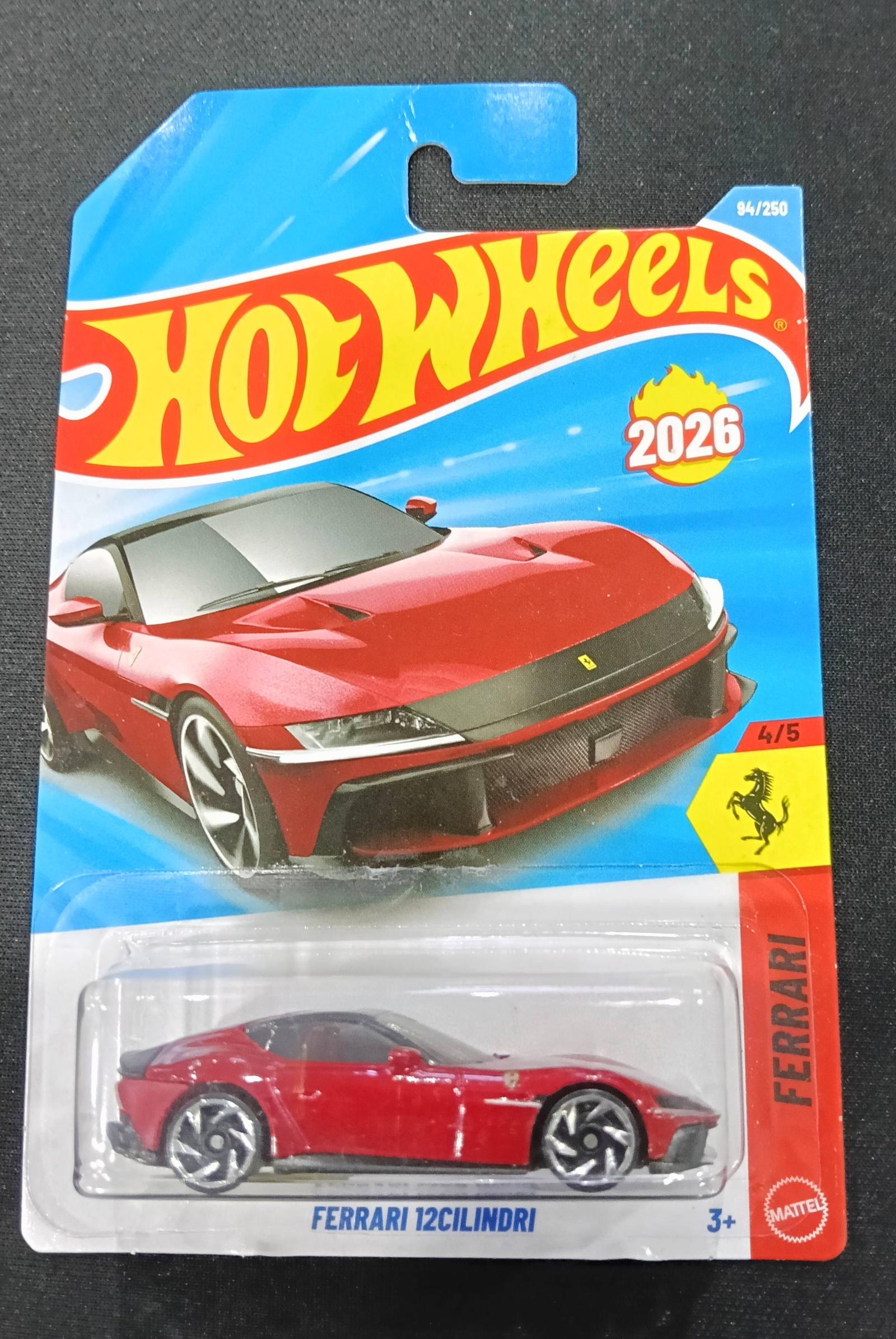 This is a Hot Wheels 2026 Ferrari 12Cilindri die-cast car in red, part of the Ferrari series (4/5). The car is still sealed in its original packaging, numbered 94 out of 250 in the 2026 collection. Suitable for collectors aged 3 and up. The packaging shows some minor wear but remains intact, preserving the collectible's value.