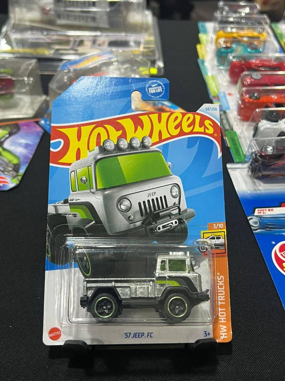 This collectible Hot Wheels die-cast model features the '57 Jeep FC from the HW Hot Trucks series. It is part of a 250-piece set and is numbered 68/250. The packaging is fully intact, showcasing vibrant colors and detailed artwork. Suitable for collectors and Hot Wheels enthusiasts.