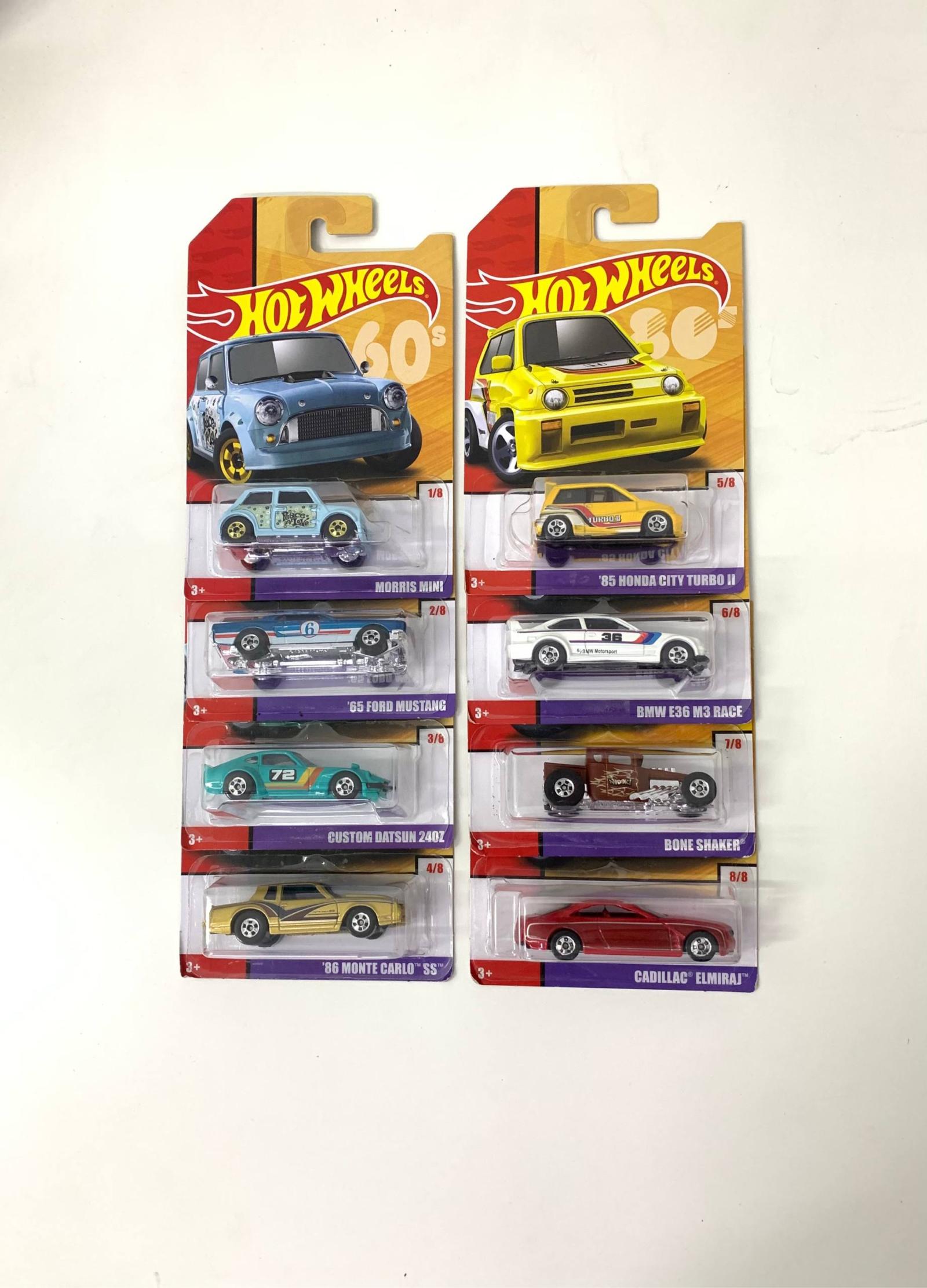 Set of 8 Hot Wheels cars featuring two themed collections: 60s and 80s. Includes Morris Mini, '65 Ford Mustang, Custom Datsun 240Z, '86 Monte Carlo SS, '85 Honda City Turbo II, BMW E36 M3 Race, Bone Shaker, and Cadillac 'Elmiraj'. All cars are sealed in original packaging.