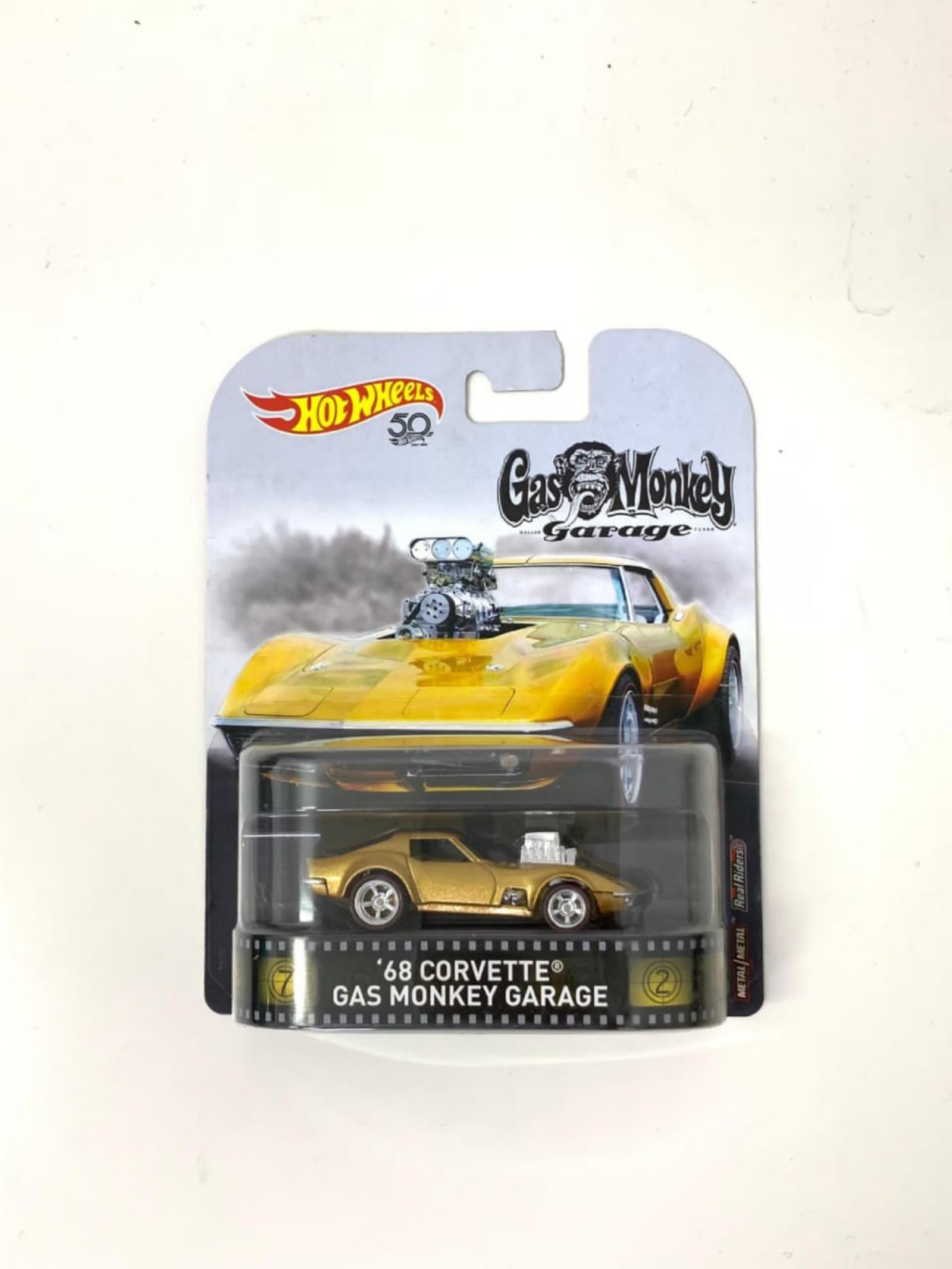 Hot Wheels 50th Anniversary '68 Corvette Gas Monkey Garage collectible car. Features gold color with detailed engine and authentic Gas Monkey Garage branding. New and unopened in original packaging suitable for collectors.