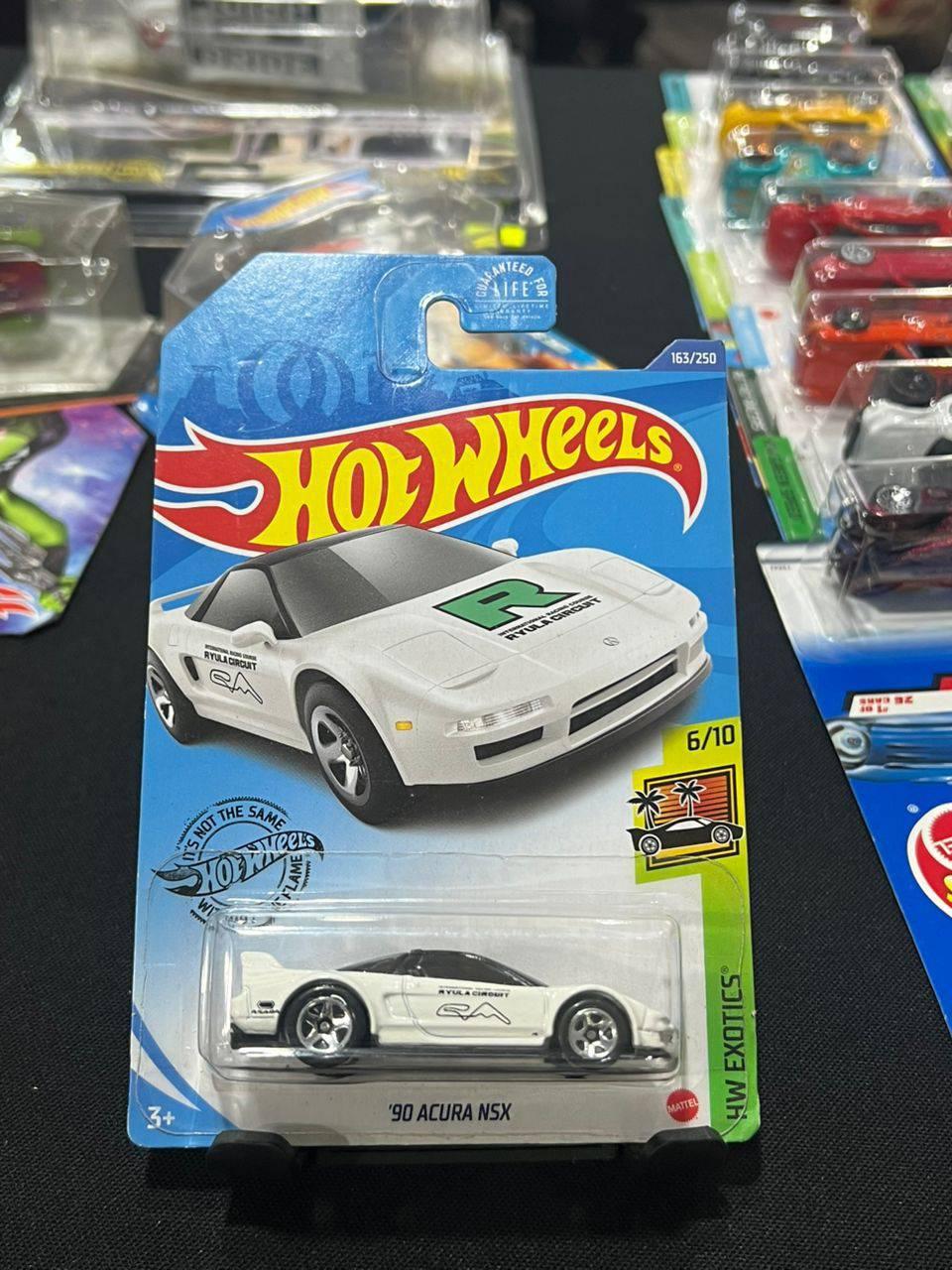 This is a Hot Wheels 2023 '90 Acura NSX from the HW Exotics series, model 6/10. The die-cast car features a white body with detailed decals and a black roof. The packaging is unopened and in good condition, showcasing the car clearly. A great collectible for Hot Wheels and Acura NSX enthusiasts.
