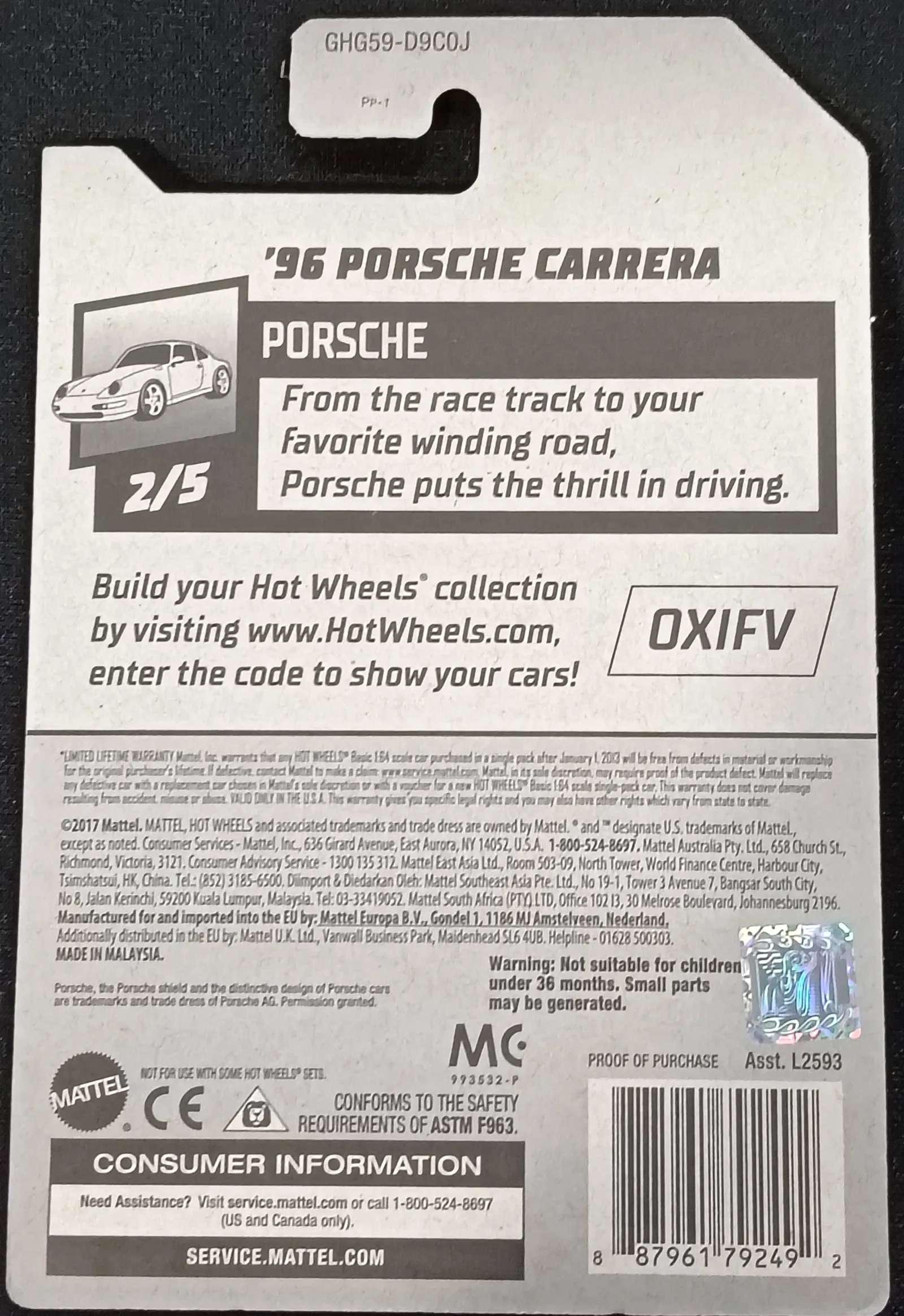 Hot Wheels 2017 release featuring a silver '96 Porsche Carrera diecast car.This item collaboration with Kroger.Part of the Porsche series, 2 out of 5. Original packaging is unopened with vibrant artwork and clear blister. Perfect for collectors and Porsche enthusiasts. FREE PROTECTOR!!!!