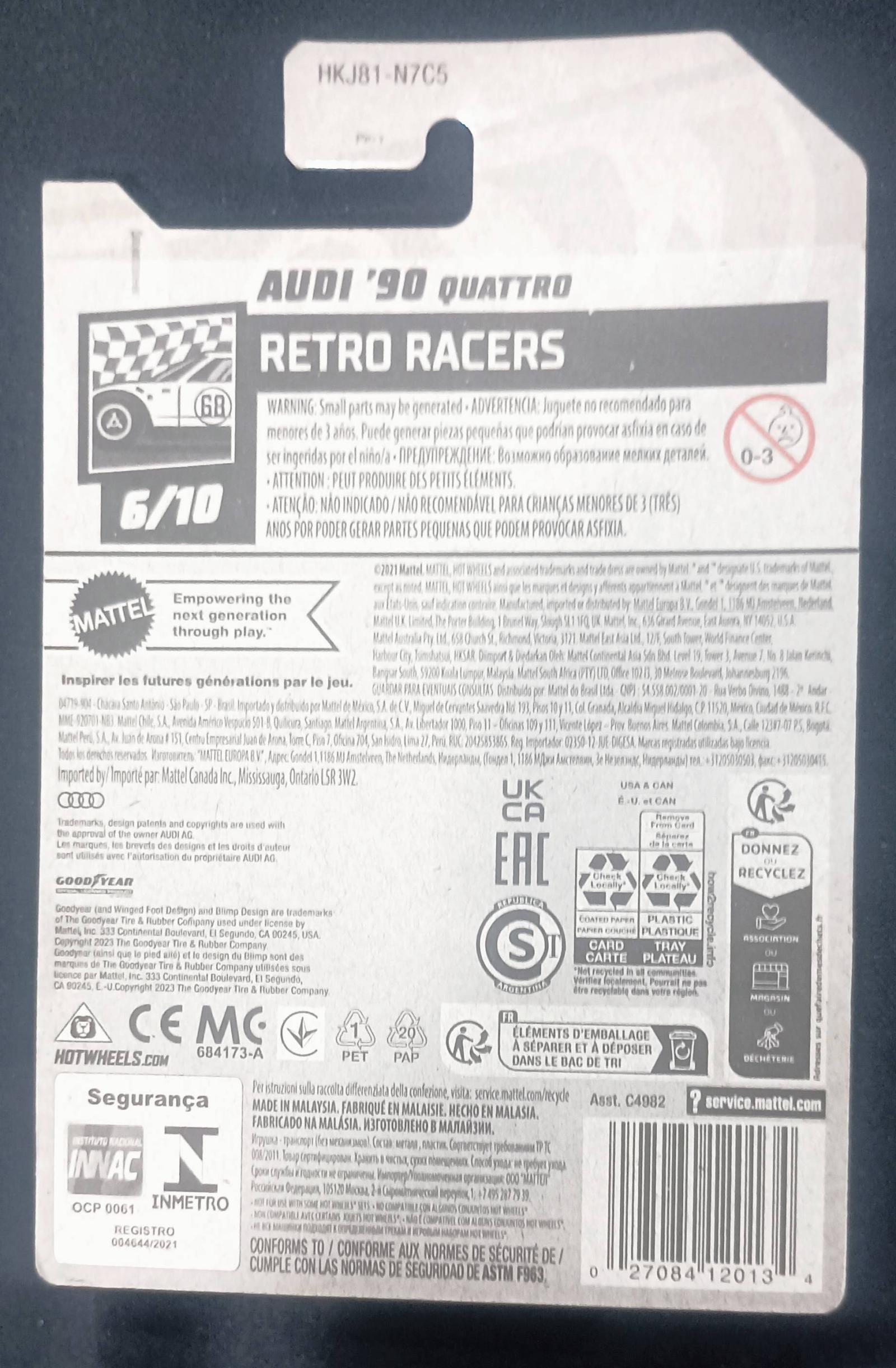 This Hot Wheels Audi '90 Quattro diecast car is part of the Retro Racers series, numbered 6 out of 10. The car features detailed racing livery and is packaged in the original card blister pack. Suitable for collectors and fans of classic racing cars. The packaging shows minor wear but is intact, ensuring a great addition to any Hot Wheels collection.