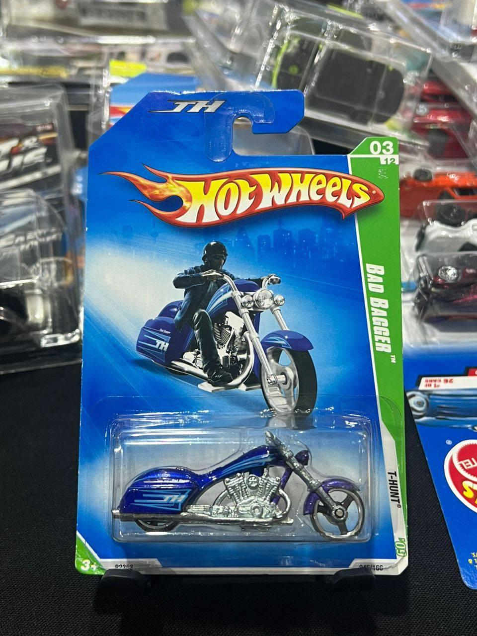 This is a Hot Wheels Bad Dagger T-Hunt motorcycle collectible, model number 03/12. The figure features a detailed blue chopper-style bike with silver engine parts. It is packaged in original blister card showing slight wear on the top hanger tab. A great addition for Hot Wheels and motorcycle collectors.
