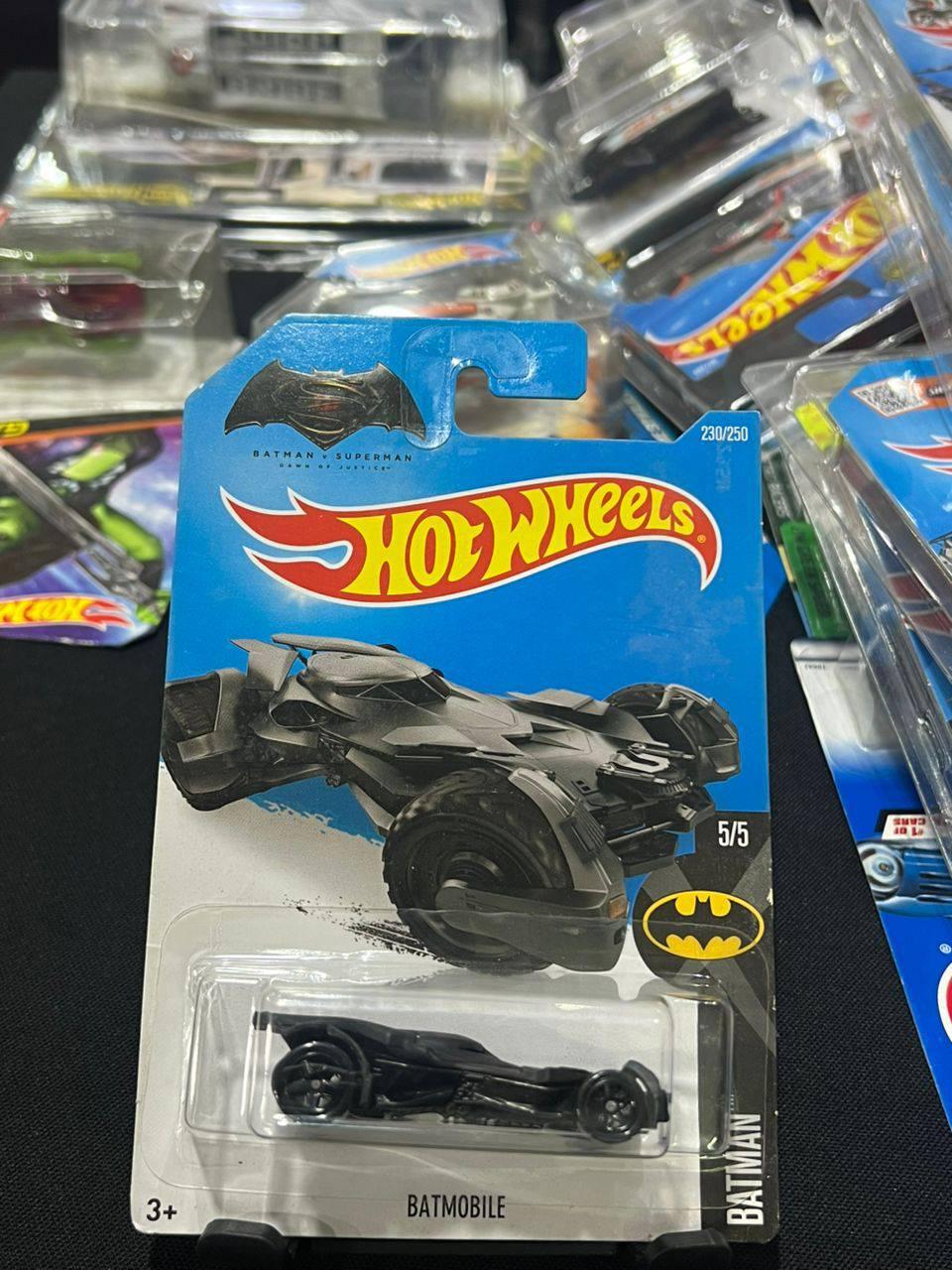 This is a limited edition Hot Wheels diecast Batmobile from the Batman v Superman series, numbered 230 out of 250. It features a sleek black design inspired by the iconic Batmobile. The collectible is sealed in its original packaging and is part of a 5/5 set for Batman. Suitable for ages 3 and up.