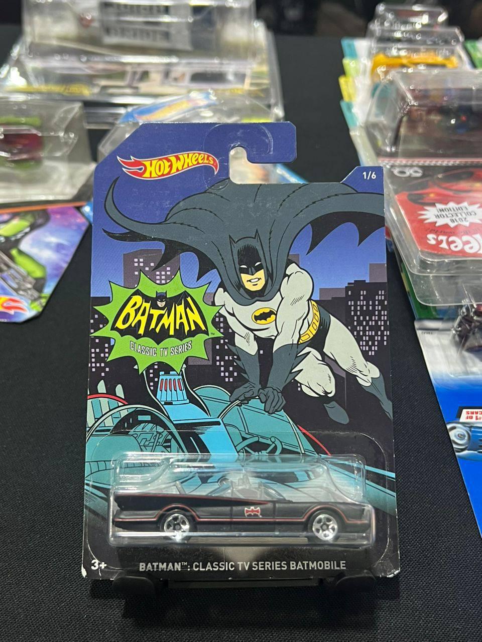 This Hot Wheels collectible features the iconic Batmobile from the classic Batman TV series. Part of a limited 6-car series, it comes in original packaging with vibrant artwork of Batman in action. Perfect for fans and collectors of both Hot Wheels and Batman memorabilia.