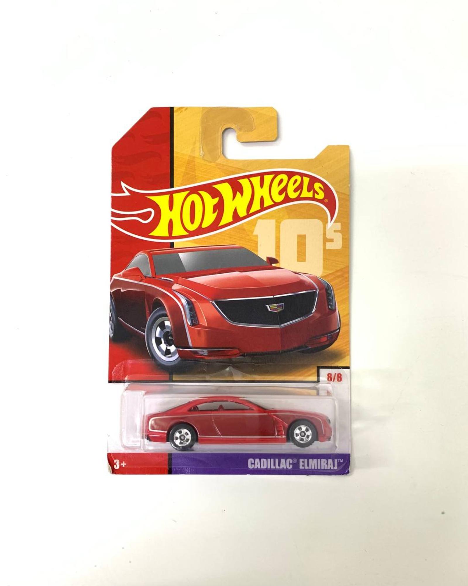 This is a Hot Wheels Cadillac Elmira die-cast car from the 10's series, numbered 8 out of 8. It comes in original packaging featuring detailed artwork of the red Cadillac Elmira. Suitable for collectors and Hot Wheels enthusiasts aged 3 and up.