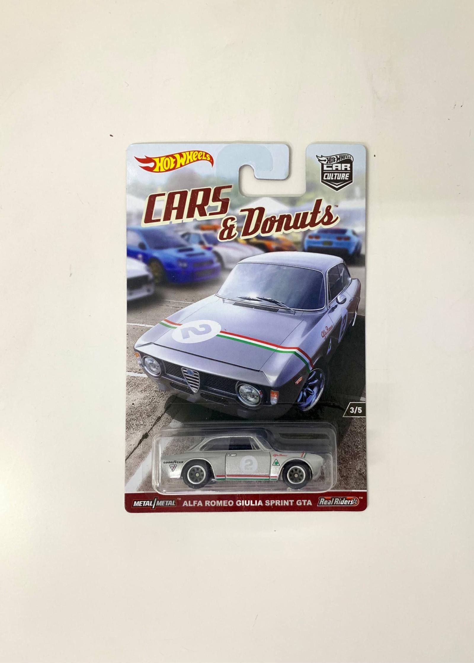 Hot Wheels Cars & Donuts series featuring the Alfa Romeo Giulia Sprint GTA. This collectible includes detailed metal construction and Real Riders tires for a realistic look. The packaging is unopened, displaying excellent preservation of both the card and blister, ideal for collectors and fans of automotive die-cast models.