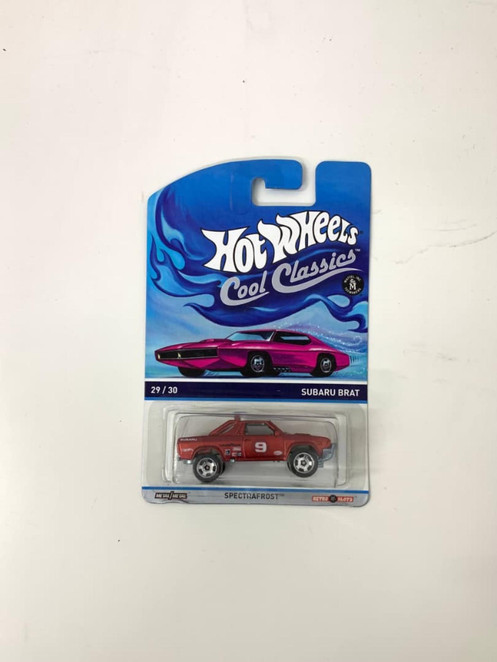 This Hot Wheels Cool Classics collectible features the Subaru Brat model in red with Spectrafrost finish. It is #29 out of 30 in the series. The die-cast car is sealed in original packaging, preserving its vibrant detail and collector appeal.