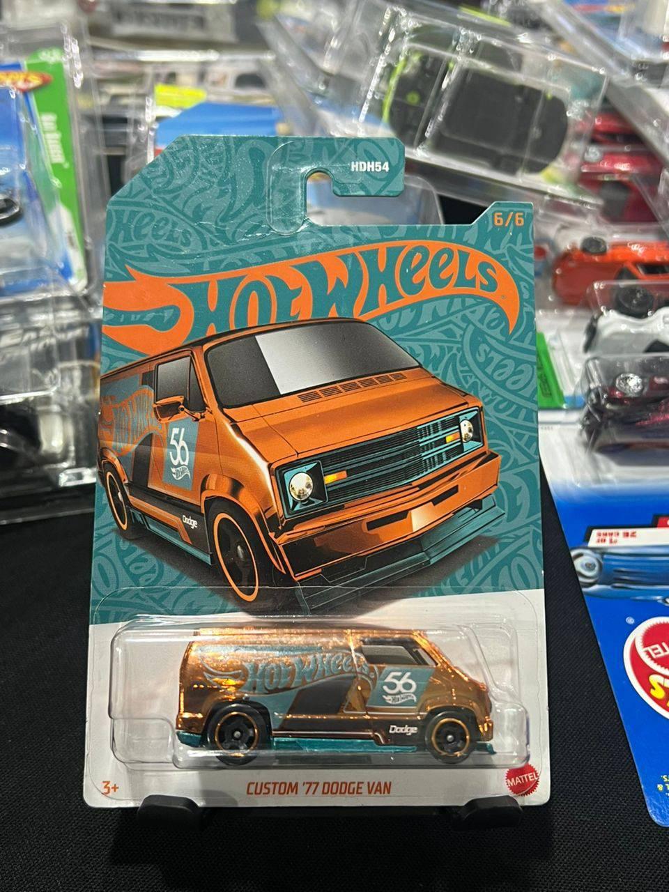 Brand new Hot Wheels Custom '77 Dodge Van in metallic orange finish. This collectible is part of a 6-piece series, numbered 6/6. The diecast van features authentic graphics and detailed design. Suitable for collectors and fans ages 3 and up. Packaged in original unopened blister card.