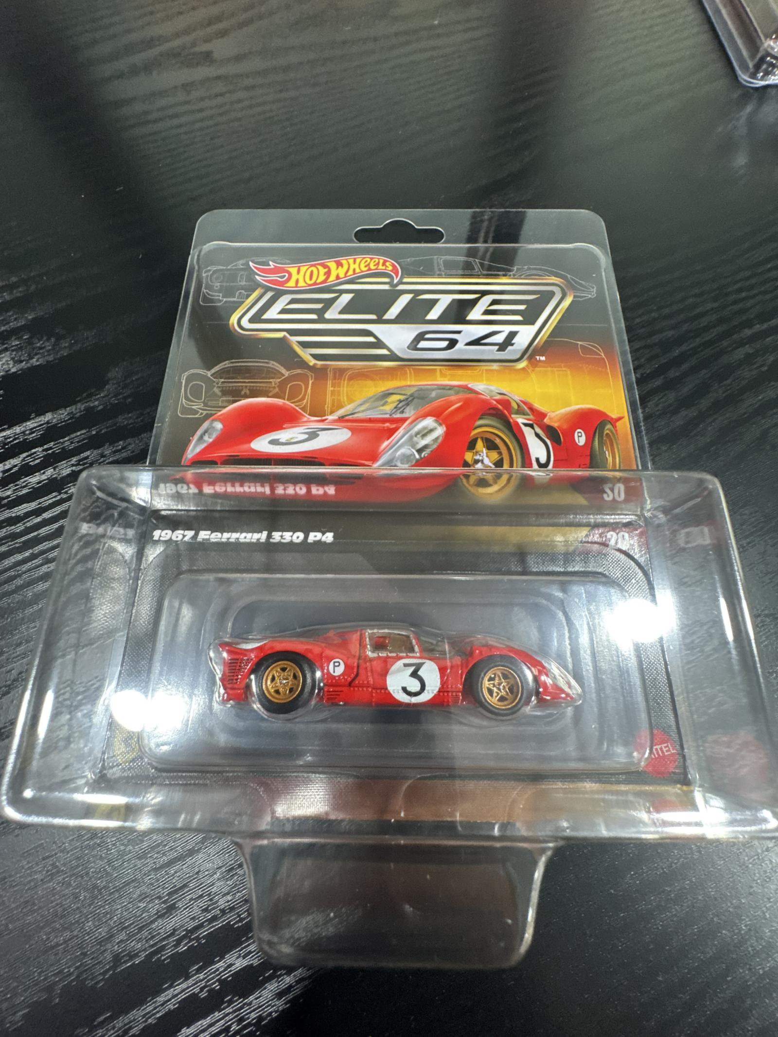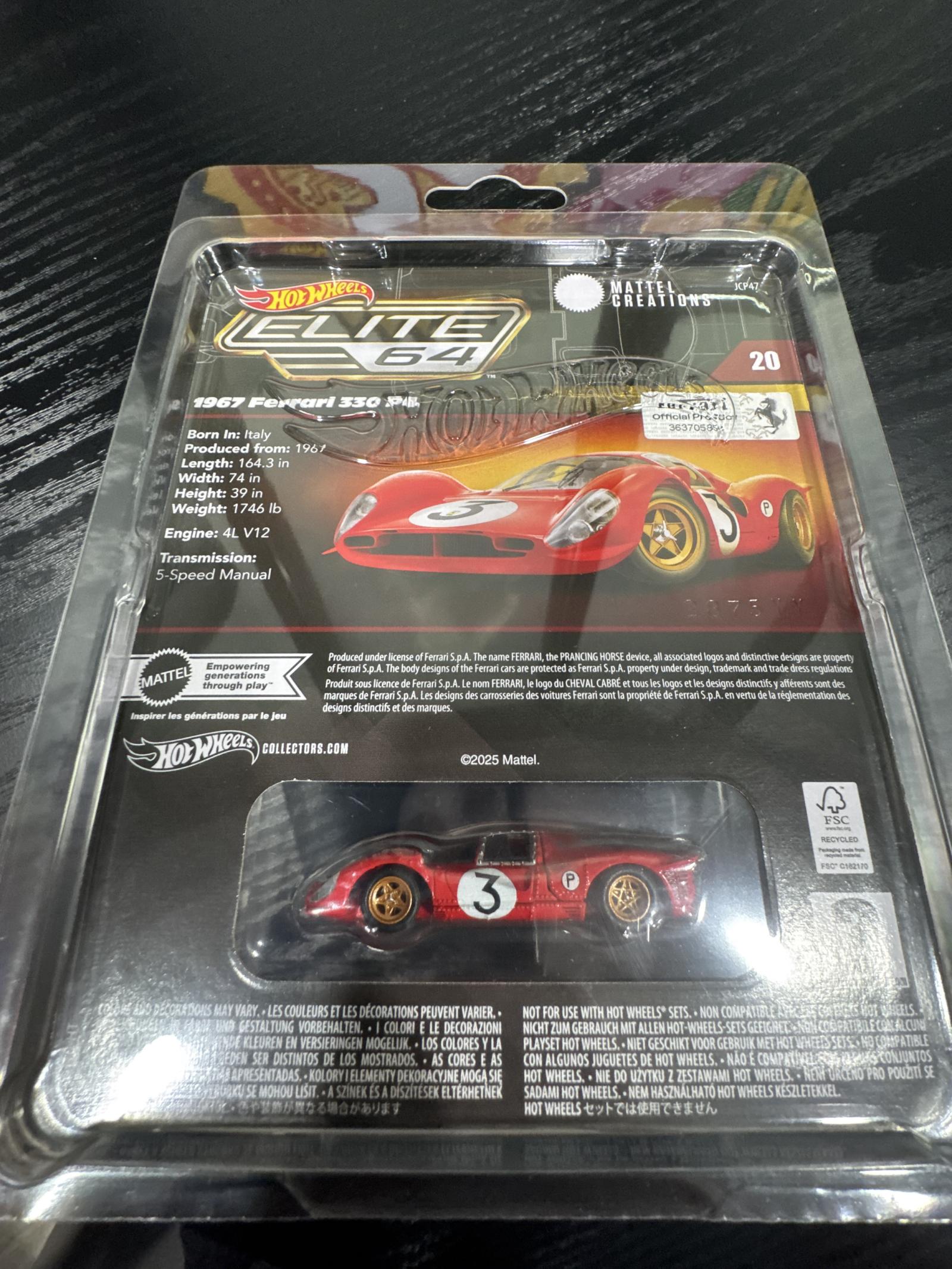 This Hot Wheels Elite 64 collectible features the 1967 Ferrari 330 P4, a detailed 1:64 scale diecast model. The car is displayed in its original blister packaging showcasing its iconic red color, racing number 3, and gold rims. The packaging includes detailed specifications of the original Ferrari 330 P4, including engine and transmission info. A premium addition to any Hot Wheels or Ferrari collection.