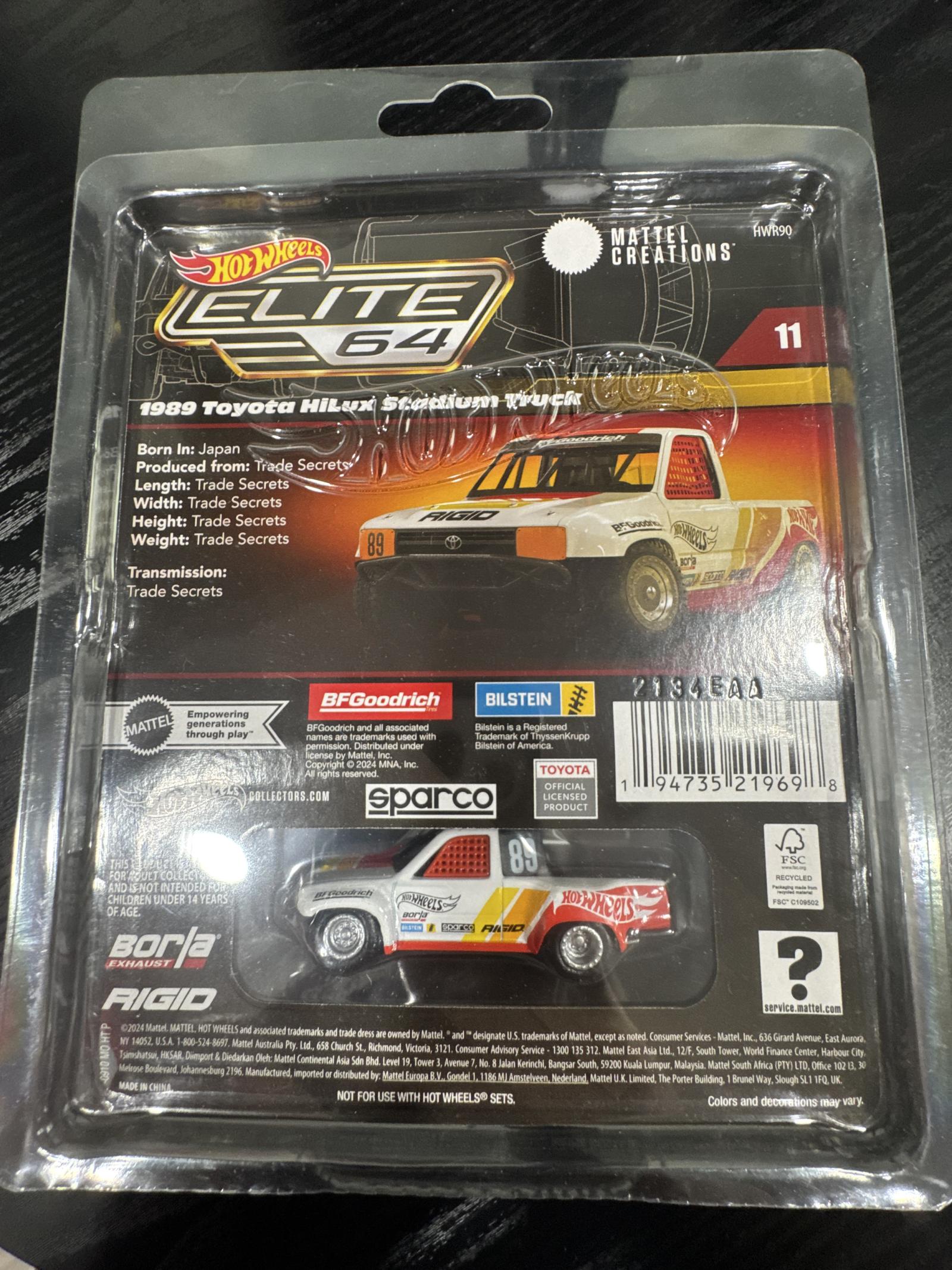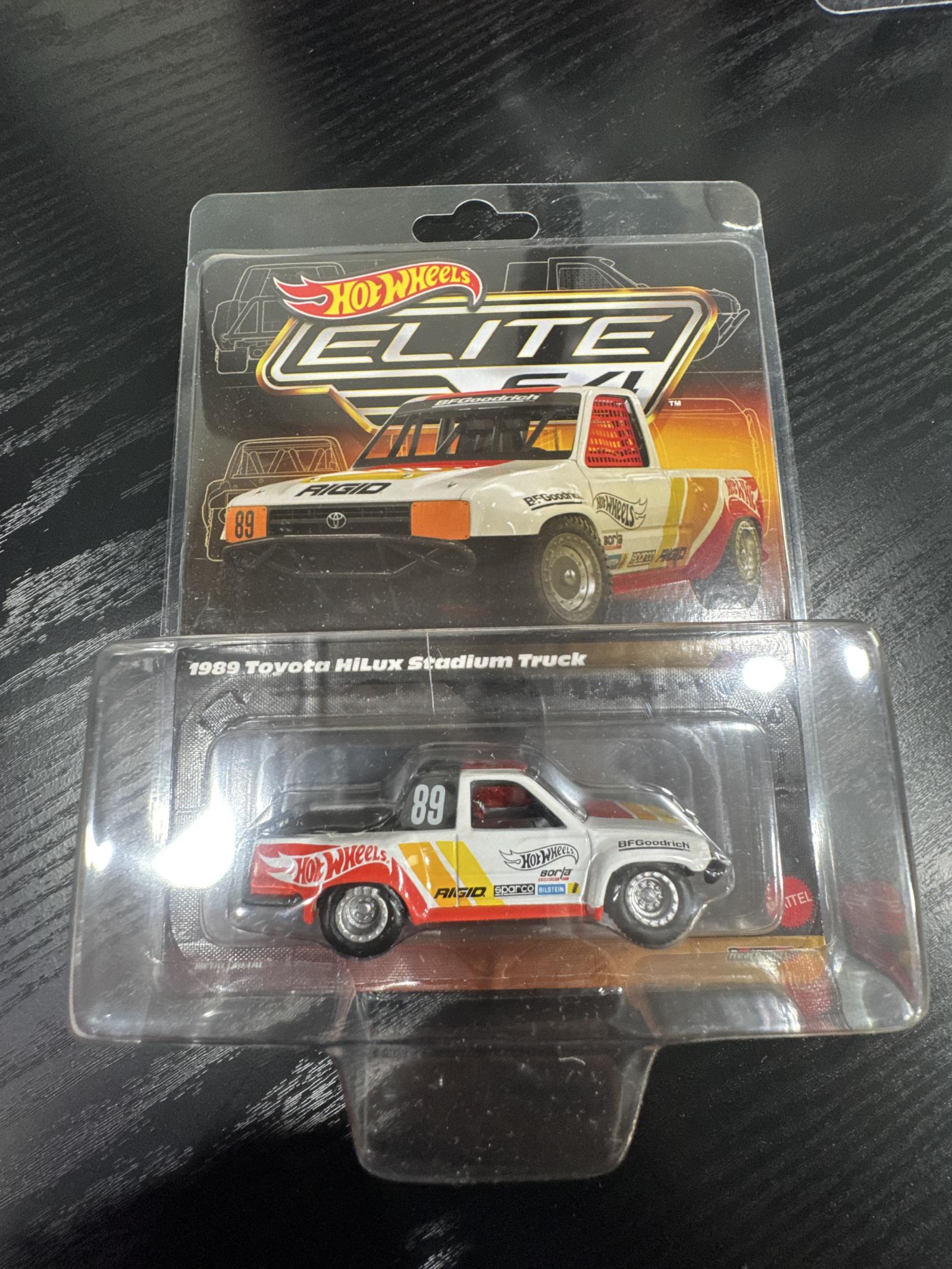 Hot Wheels Elite 64 scale collectible featuring the 1989 Toyota Hilux Stadium Truck. This detailed diecast model comes in original sealed packaging. The truck has authentic racing decals including Hot Wheels, Rigid, BFGoodrich, Sparco, and Bilstein. Perfect for collectors looking for a high-quality Hot Wheels Elite 64 model.