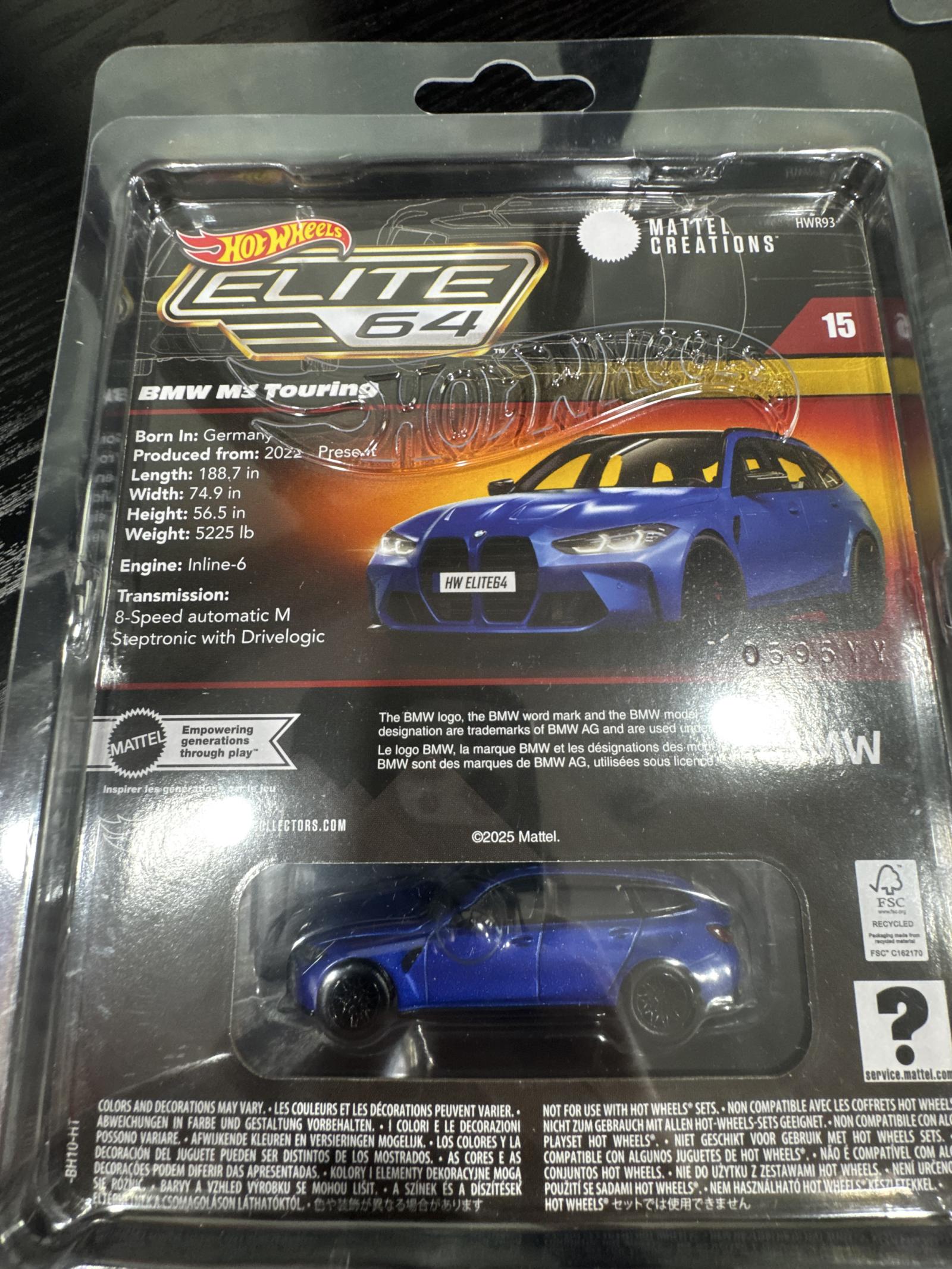 This Hot Wheels Elite 64 BMW M3 Touring collectible features a detailed 1:64 scale model of the BMW M3 Touring in blue. It comes in original sealed packaging, showcasing the car's specifications including engine type (Inline-6) and transmission (8-Speed automatic M Steptronic). The packaging displays vibrant artwork and is part of the Mattel Creations series, numbered 15. Perfect for collectors and enthusiasts of detailed die-cast car models.