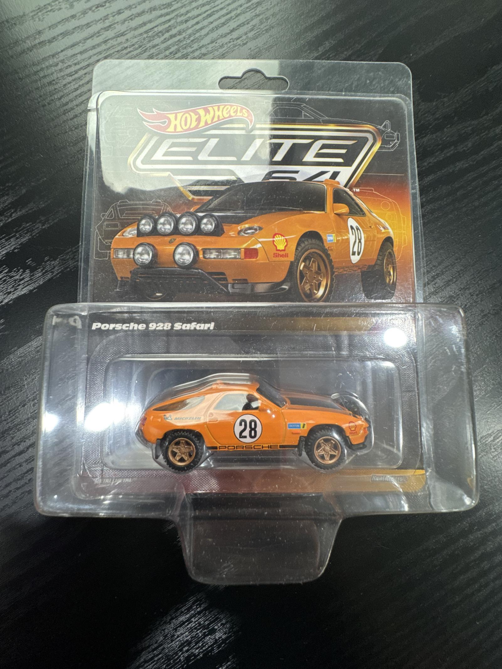 Hot Wheels Elite 64 series collectible diecast model of the Porsche 928 Safari, numbered 28. The orange rally car features detailed lights and decals, packaged in original sealed blister card. Officially licensed by Porsche and Mattel, targeted for adult collectors.