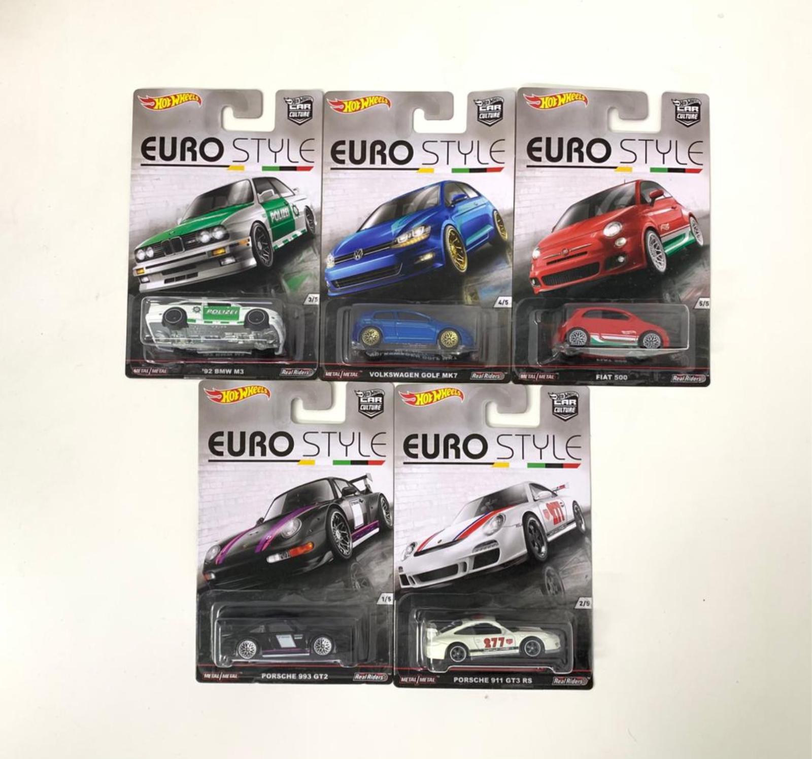 A set of five Hot Wheels Euro Style cars including '92 BMW M3, Volkswagen Golf MK7, Fiat 500, Porsche 993 GT2, and Porsche 911 GT3 RS. Each car is sealed in individual original packaging, part of the Hot Wheels Car Culture series featuring detailed Euro-style European models. Perfect collectible set for Hot Wheels enthusiasts.