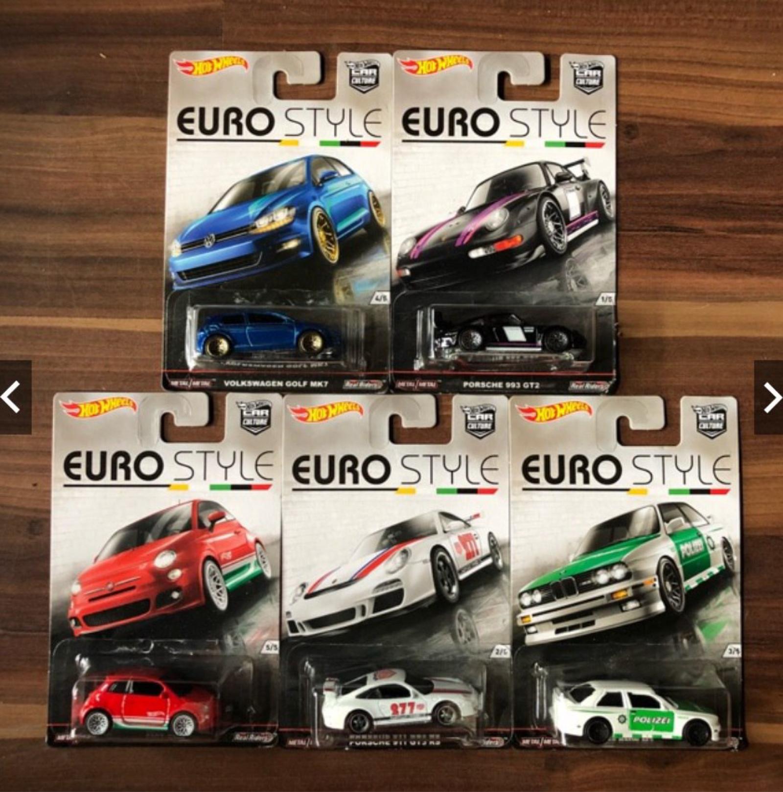 Set of 5 Hot Wheels Euro Style die-cast cars, including Volkswagen Golf MK7, Porsche 993 GT2, Fiat 500, Porsche 911 GT3 RS, and BMW M3 Polizei. Each car is sealed in original packaging with Euro Style branding. Perfect for collectors of European car models and Hot Wheels enthusiasts.