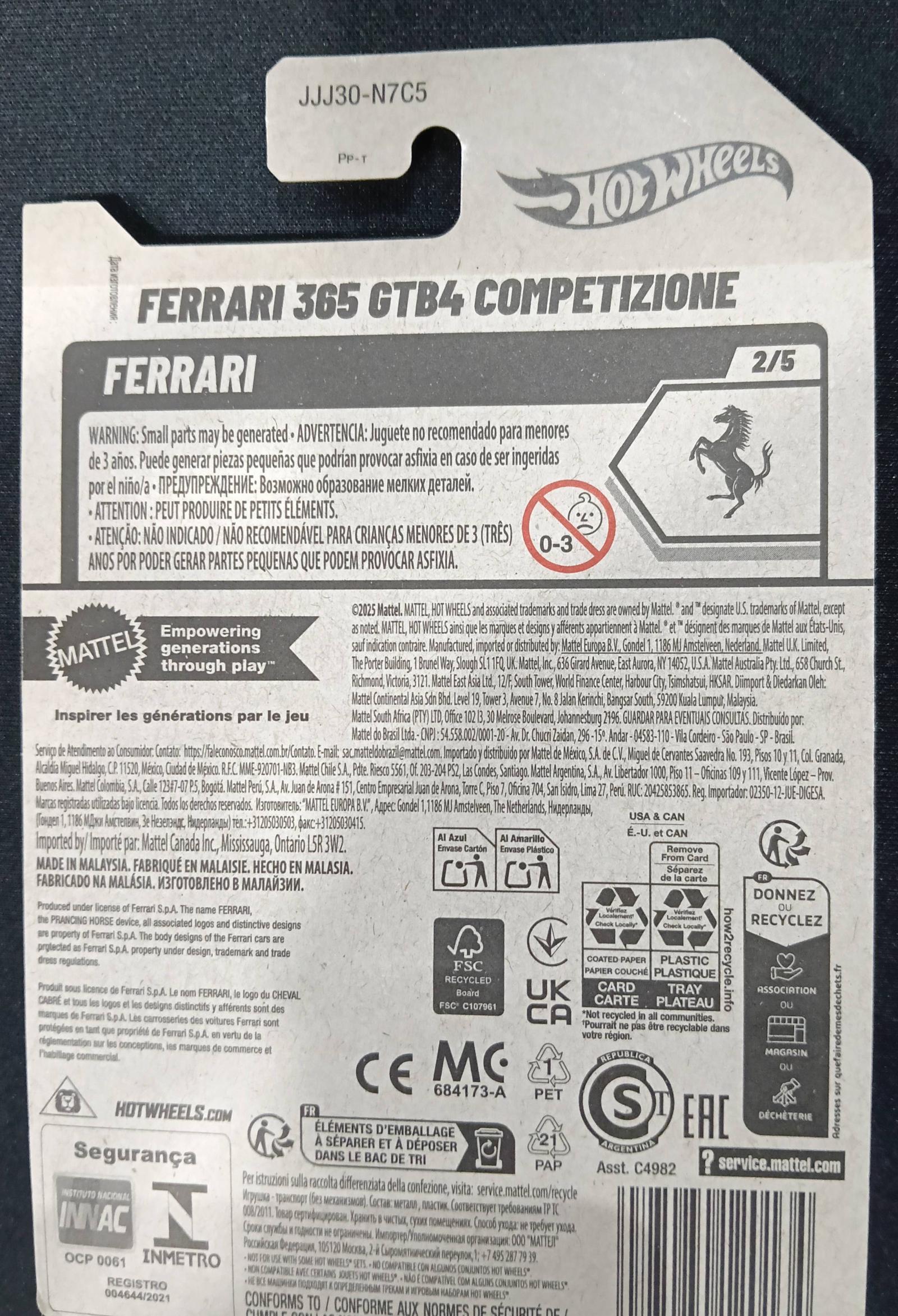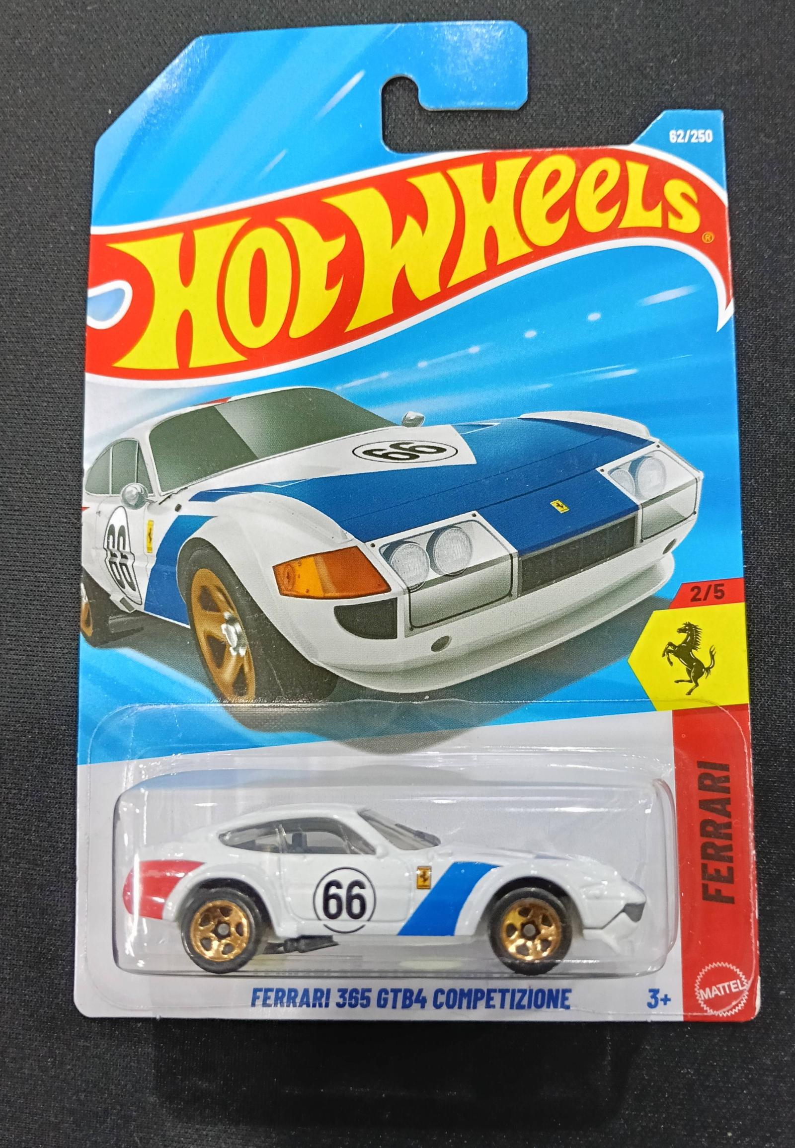 This Hot Wheels diecast collectible features the Ferrari 365 GTB4 Competizione in white with blue racing stripes and the number 66. It is part of the 2025 Hot Wheels series, numbered 62 out of 250, and 2 out of 5 in the Ferrari subset. The car has detailed paint and gold rims, packaged in original sealed blister packaging with vibrant graphics and minimal wear. A great addition for Hot Wheels and Ferrari collectors.