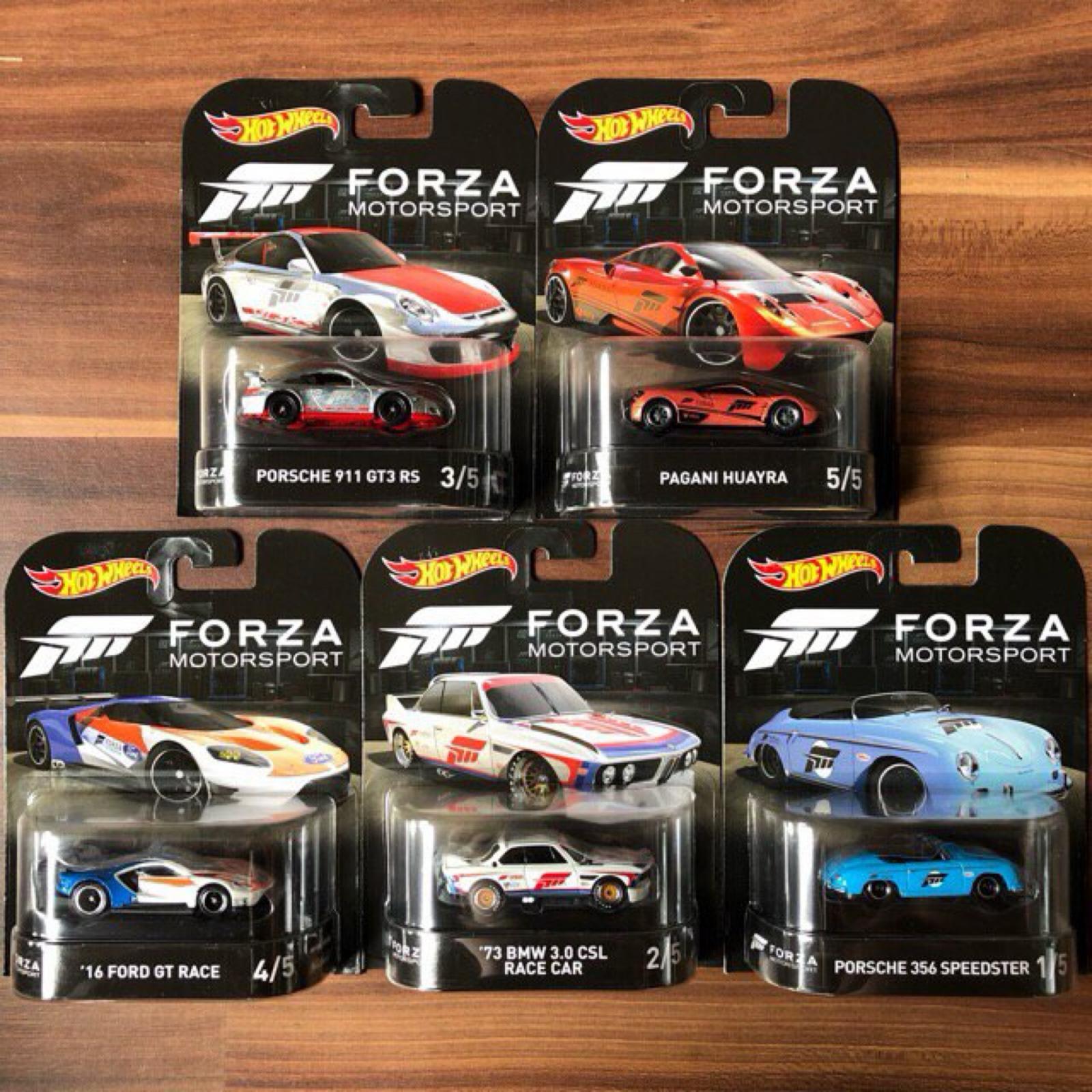 Complete set of 5 Hot Wheels Forza Motorsport collectible cars featuring Porsche 911 GT3 RS, Pagani Huayra, 2016 Ford GT Race, '73 BMW 3.0 CSL Race Car, and Porsche 356 Speedster. Each car is packaged in original sealed blister cards with vibrant designs and detailed replicas from the Forza Motorsport series.