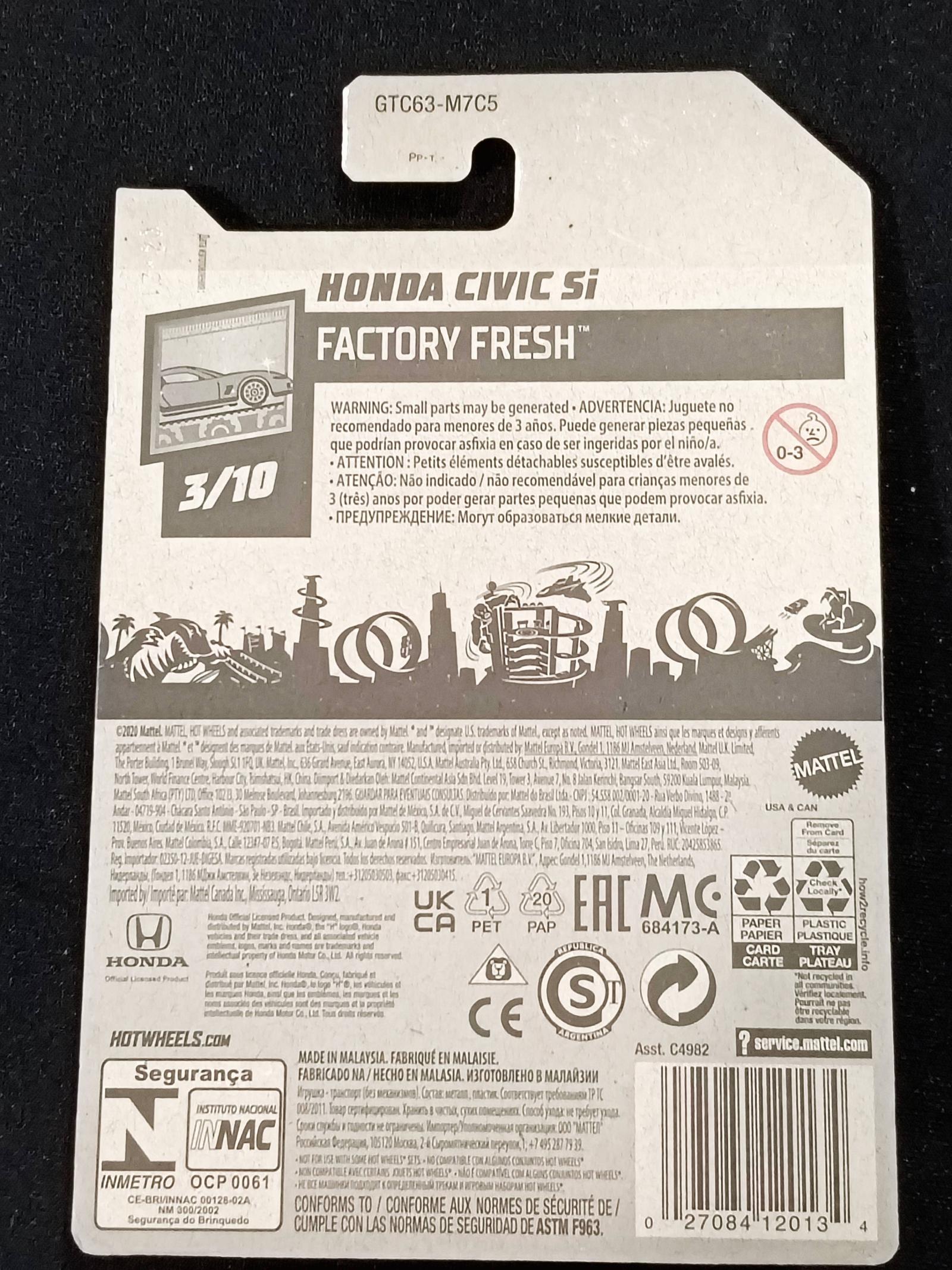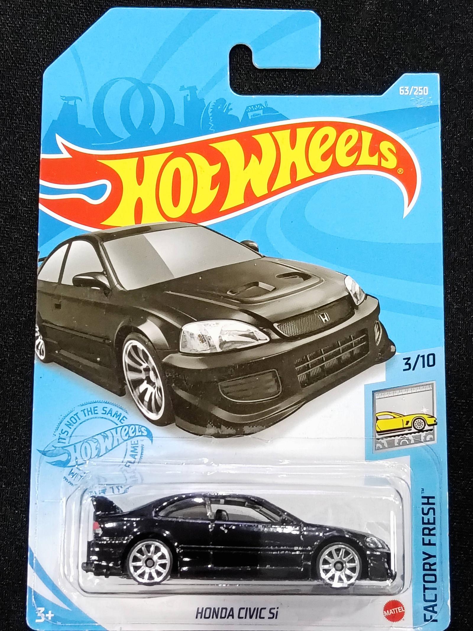 Hot Wheels Factory Fresh series featuring a black Honda Civic Si model. This edition is 3 out of 10 in the series and numbered 63 out of 250 in the 2020 lineup. The die-cast car is mint in original sealed packaging with bright, undamaged card and clear plastic bubble.