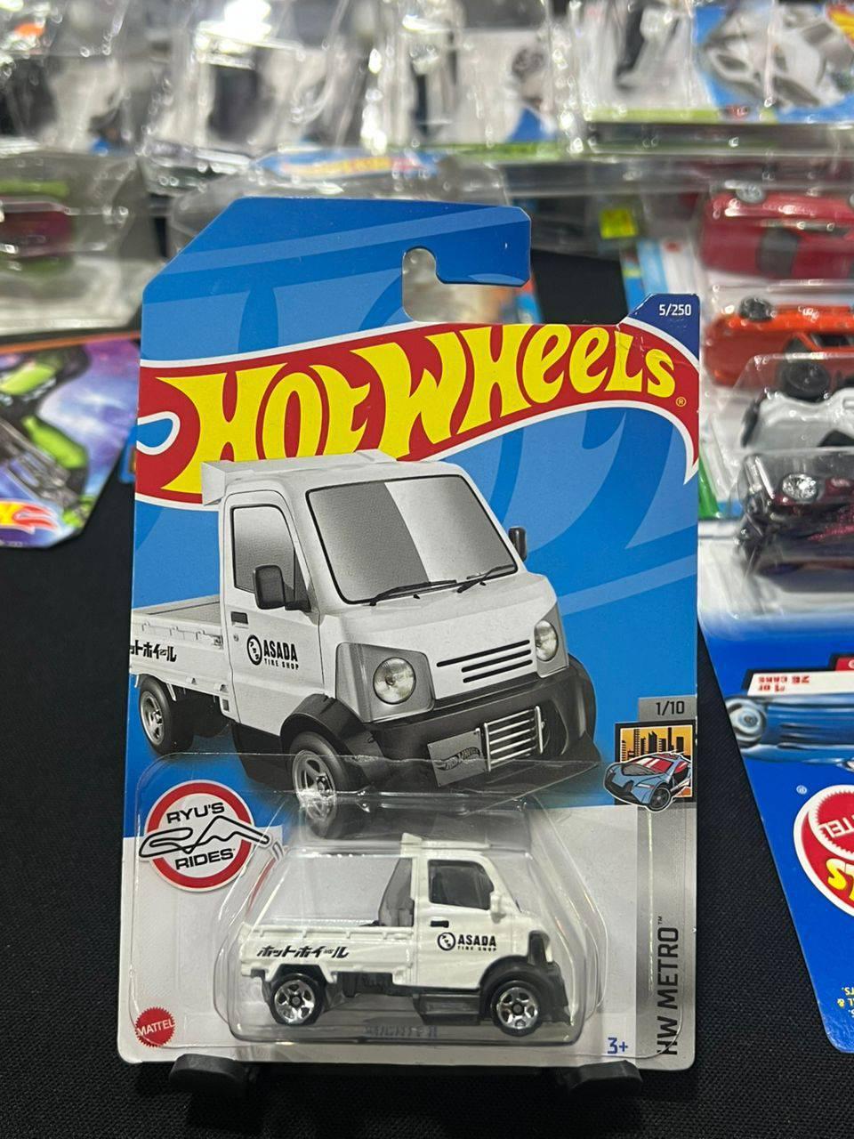 Hot Wheels HW Metro die-cast model of a white mini truck from the Ryu's Rides series. This collectible is number 5 out of 250 in the 2022 set and 1 of 10 in the Ryu's Rides series. The packaging features Japanese text and detailed truck graphics. Suitable for ages 3 and up.