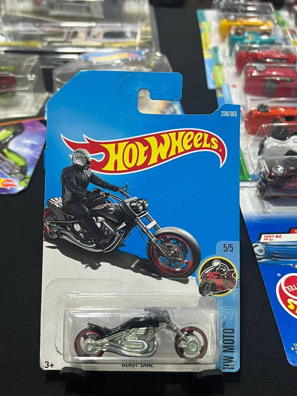 Hot Wheels HW Moto series collectible die-cast motorcycle 'Beast Lane' in original packaging. Numbered 236 of 365, this piece is part of a limited series and features detailed design with red accents on the wheels. Suitable for ages 3 and up.
