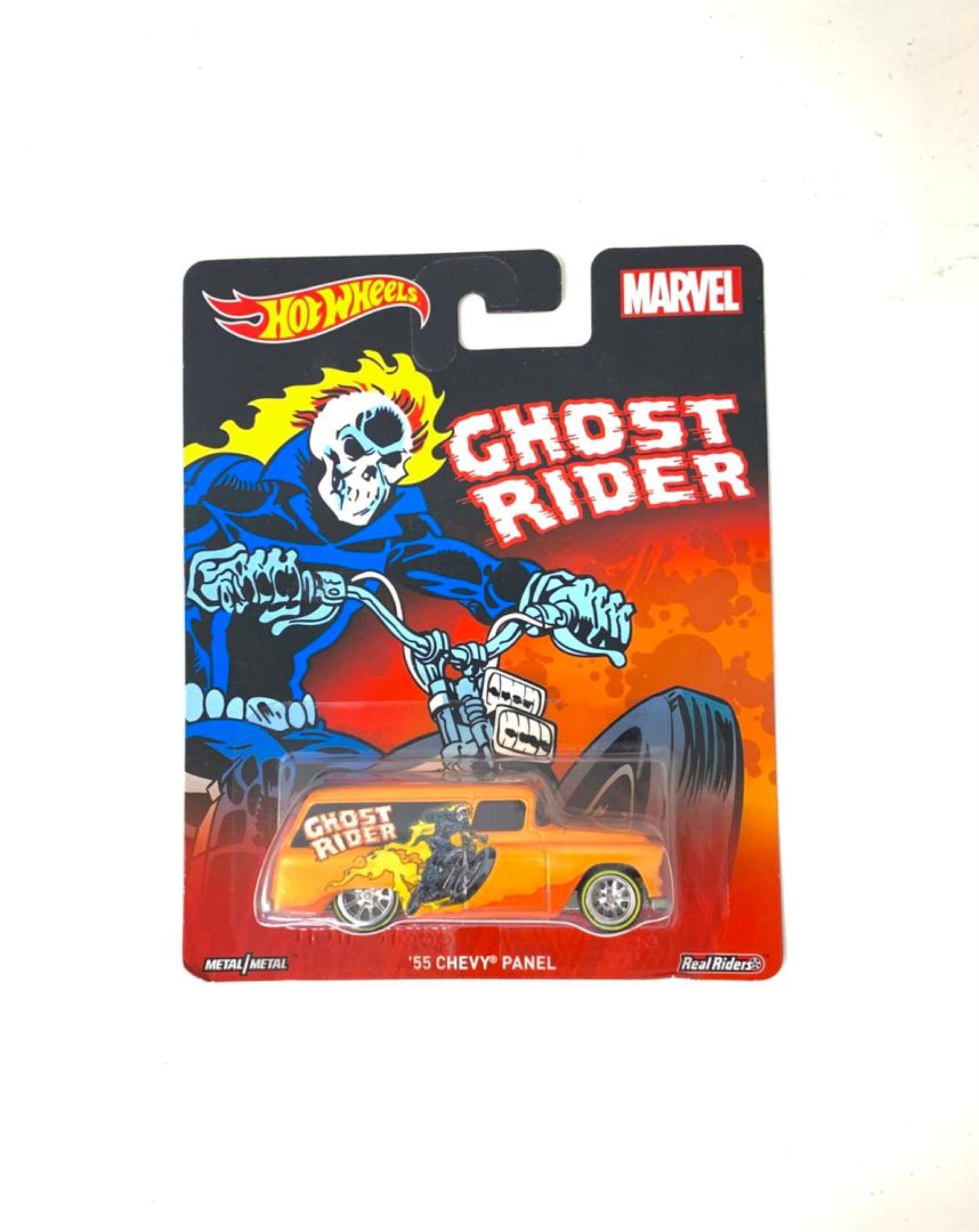 Collectible Hot Wheels diecast featuring the Marvel Ghost Rider theme on a '55 Chevy Panel. The packaging showcases vibrant Ghost Rider artwork with the car encased in clear plastic, highlighting detailed graphics of Ghost Rider and flames on the vehicle. A must-have for Hot Wheels collectors and Marvel fans.